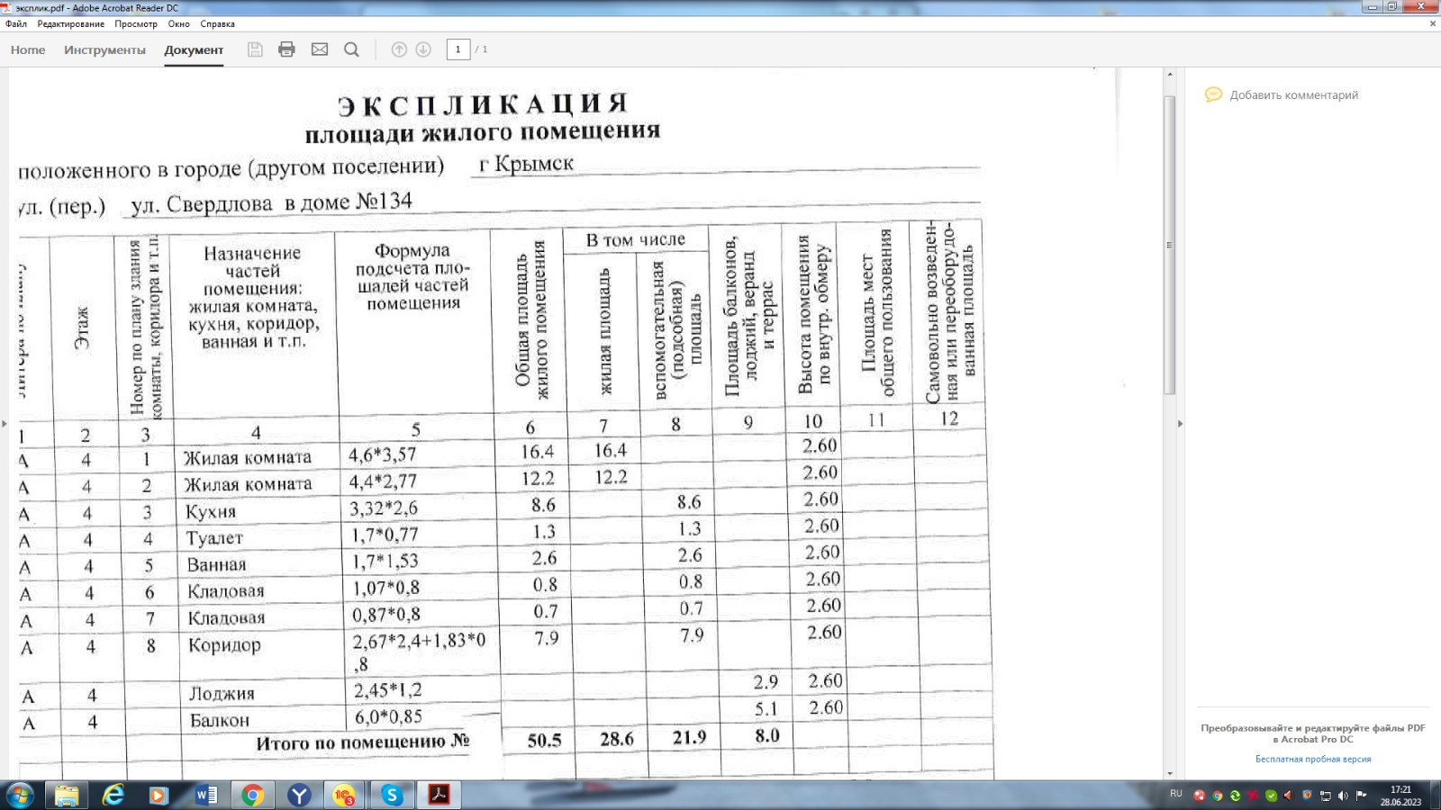 Общая площадь 50.5 м2