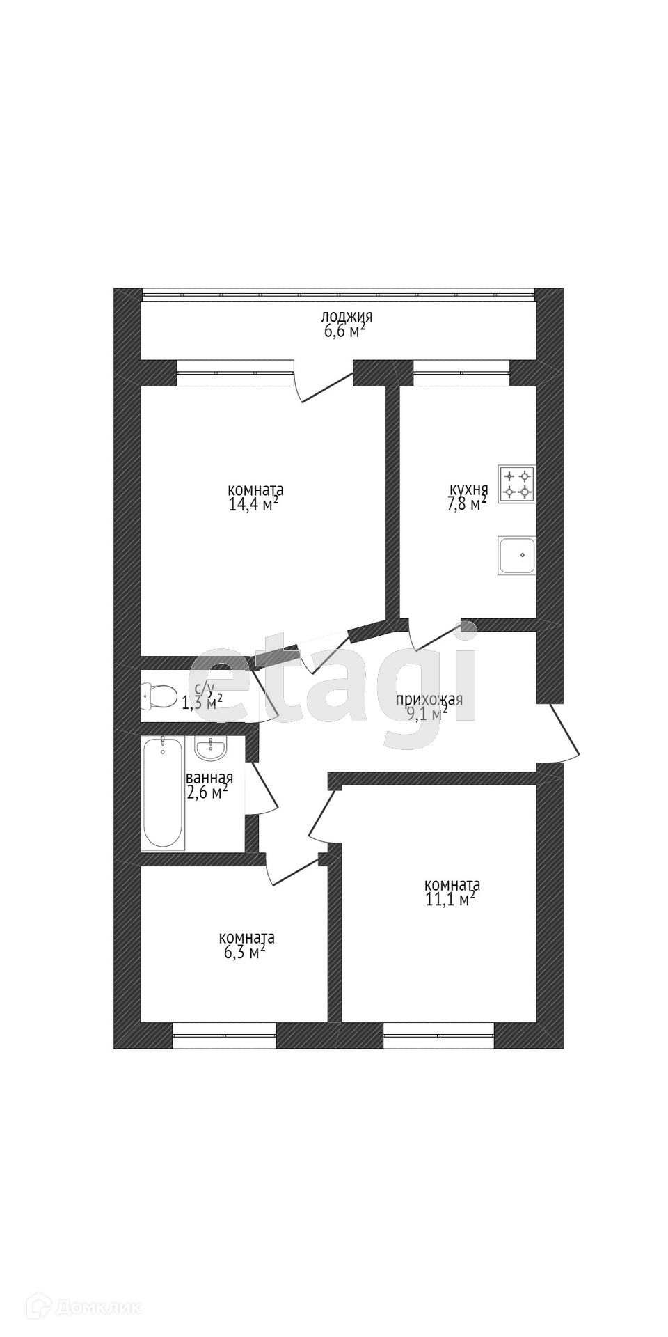 Общая площадь 52.8 м2