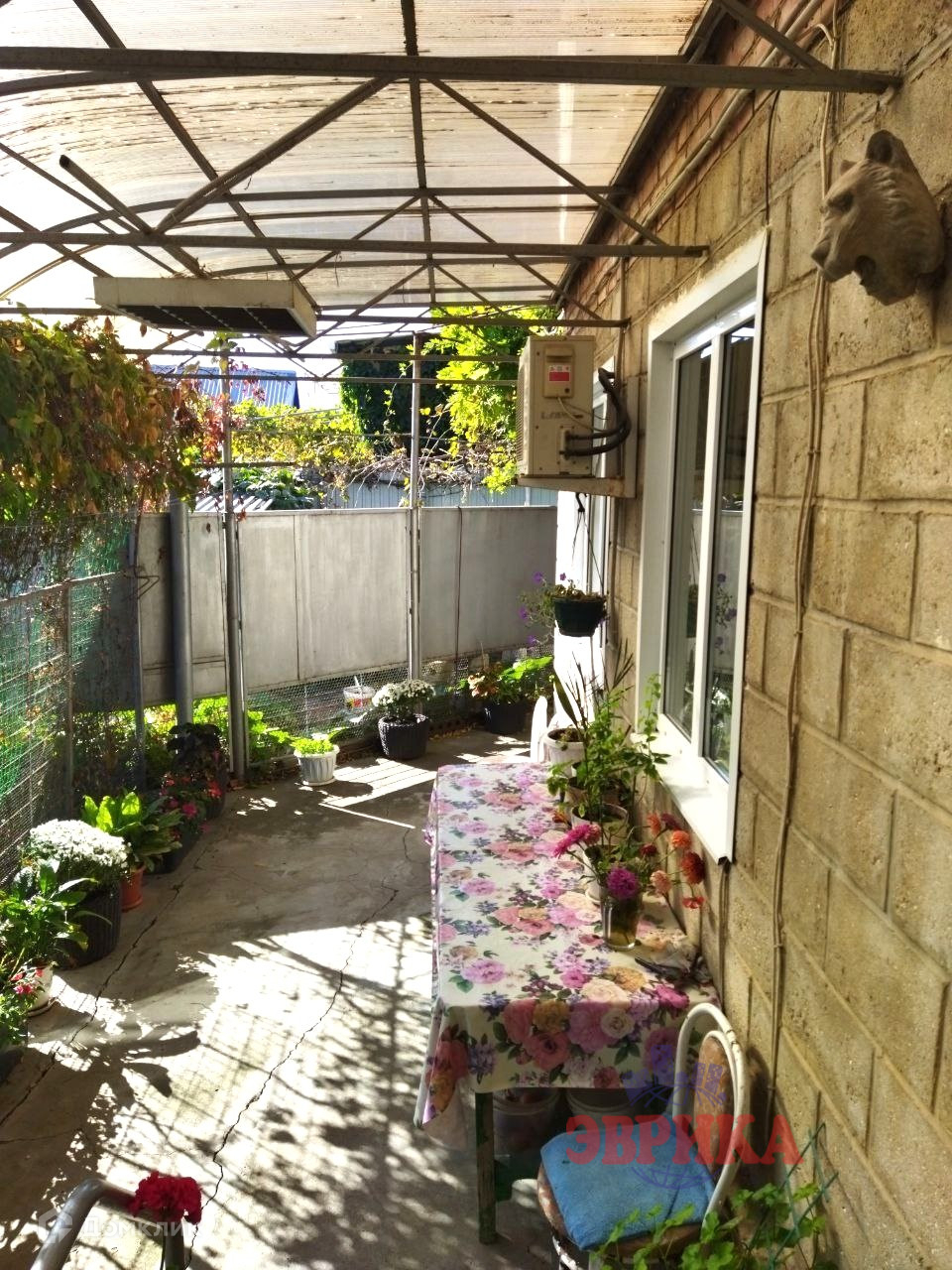 Двор забетонирован, укрыт навесом, огорожен забором.