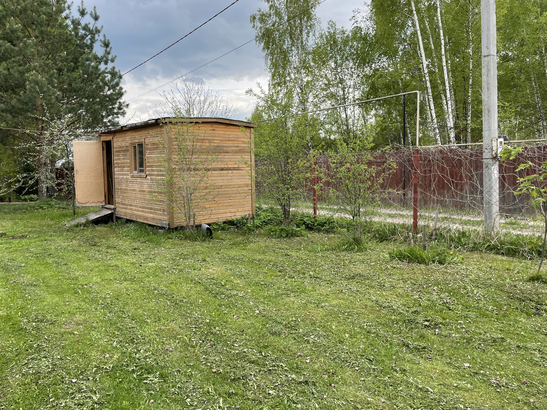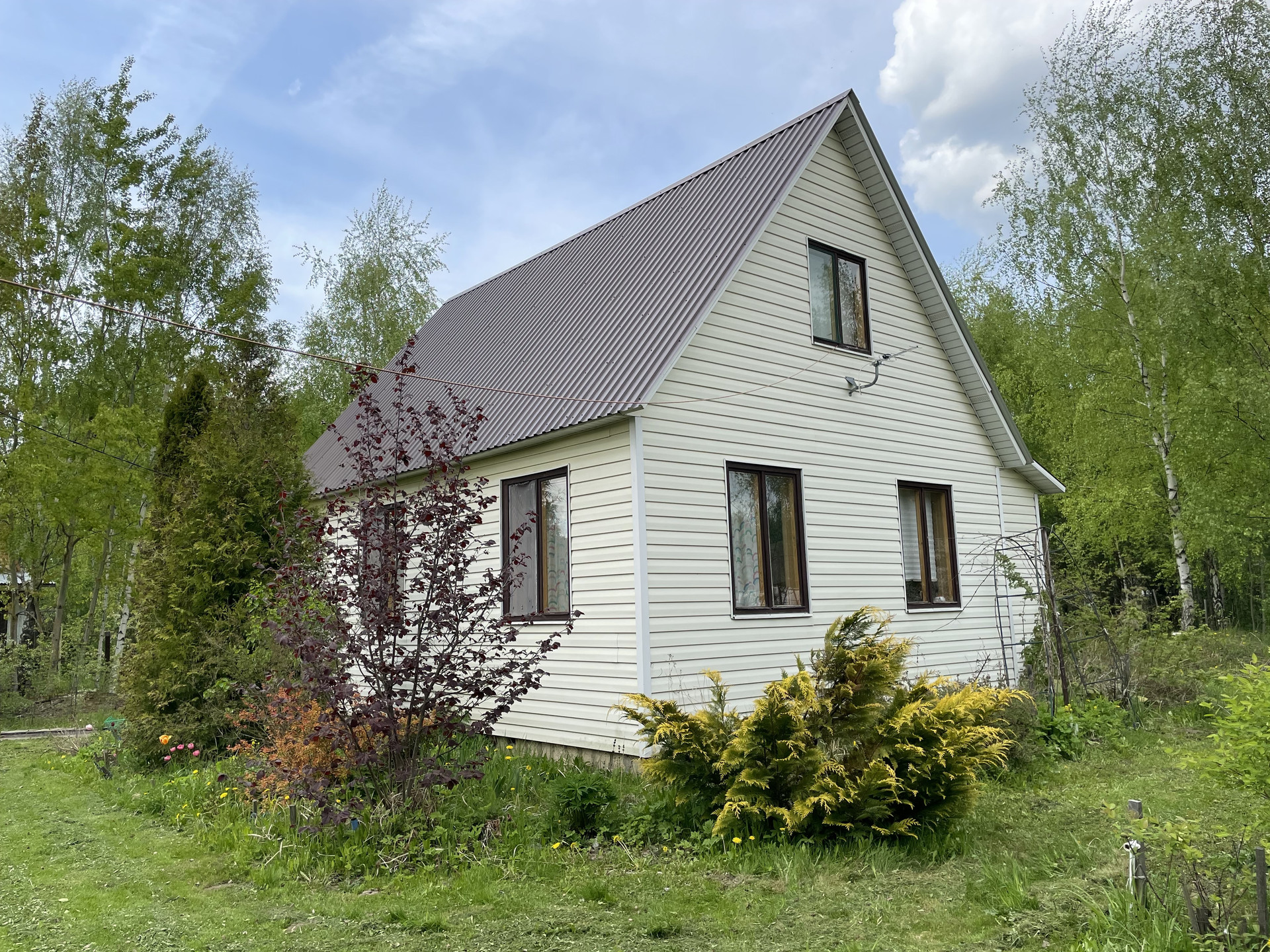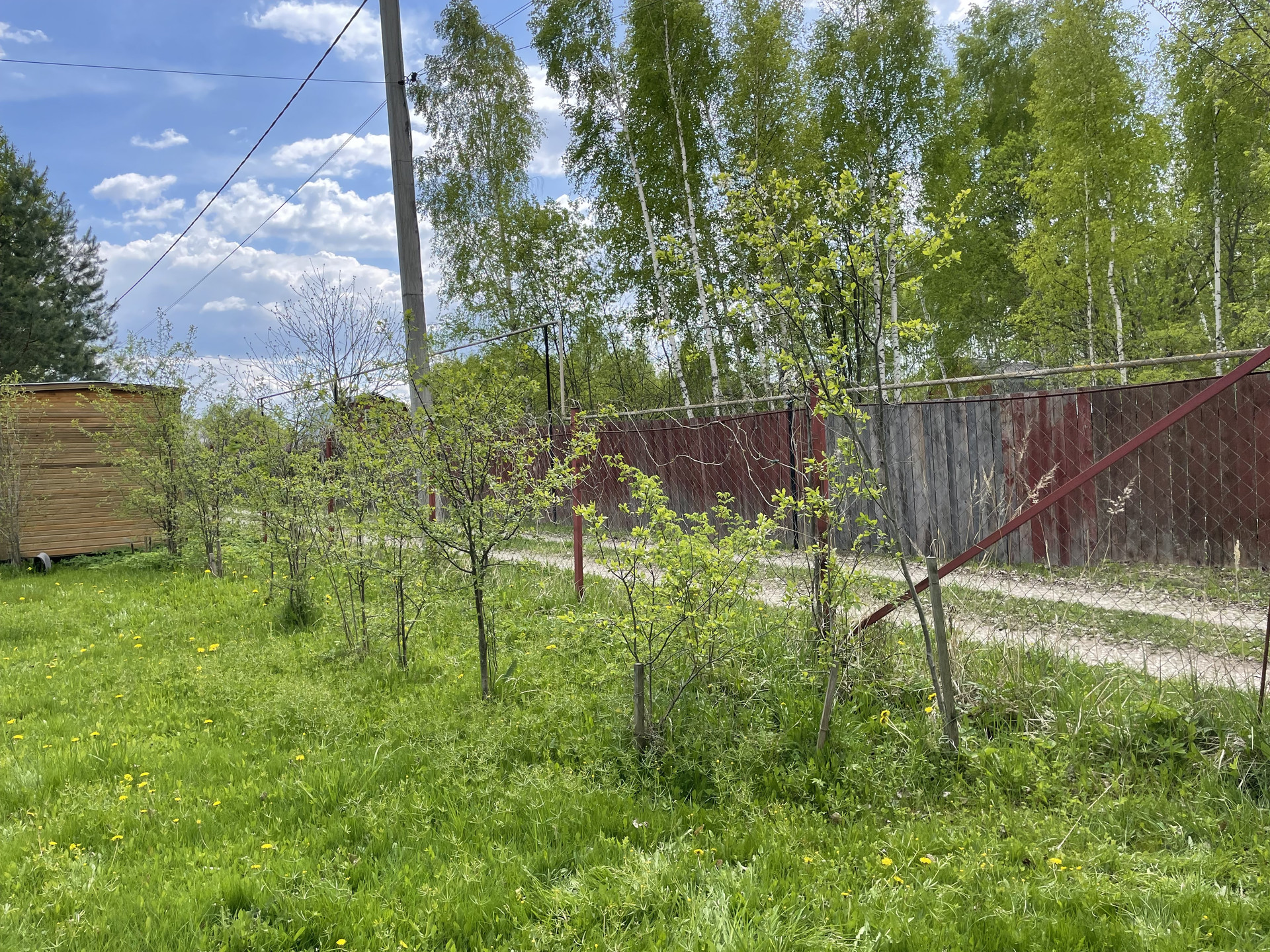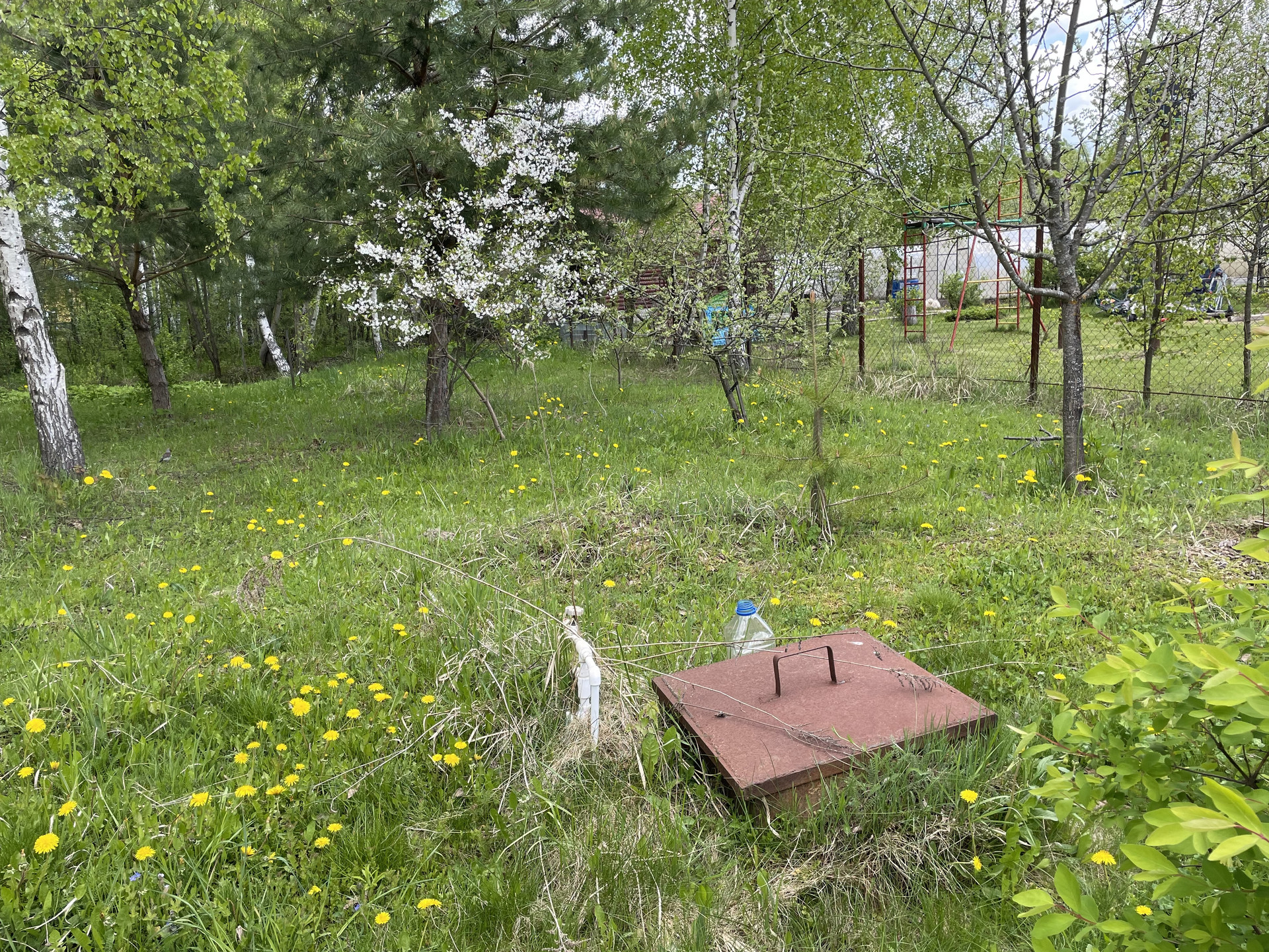На участке плодовые деревья-яблони, черешни, вишни, орех; плодовые кусты-малина, жимолость, крыжовник. Клубника, земляника. Грядки для помидоров, и для зелени. Посажены хвойники, много цветов. На участке есть пруд с камышами.