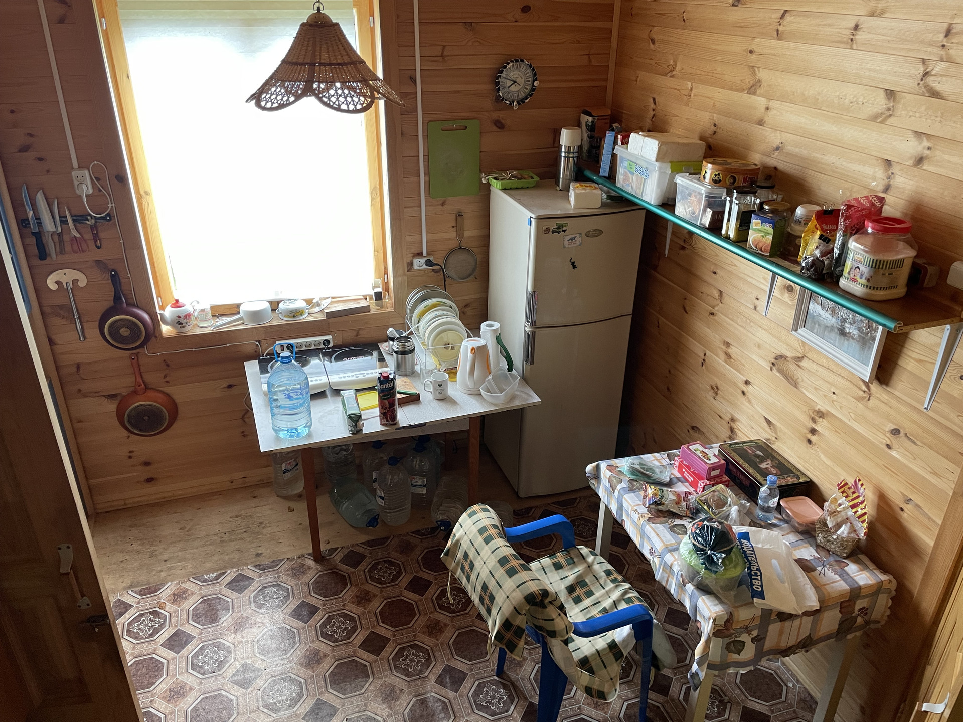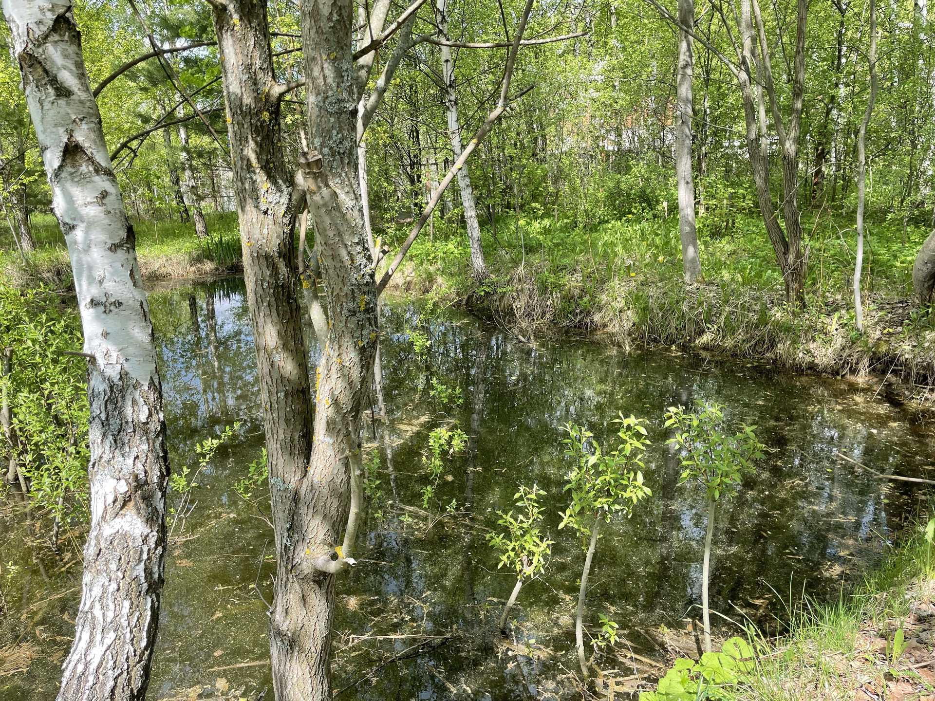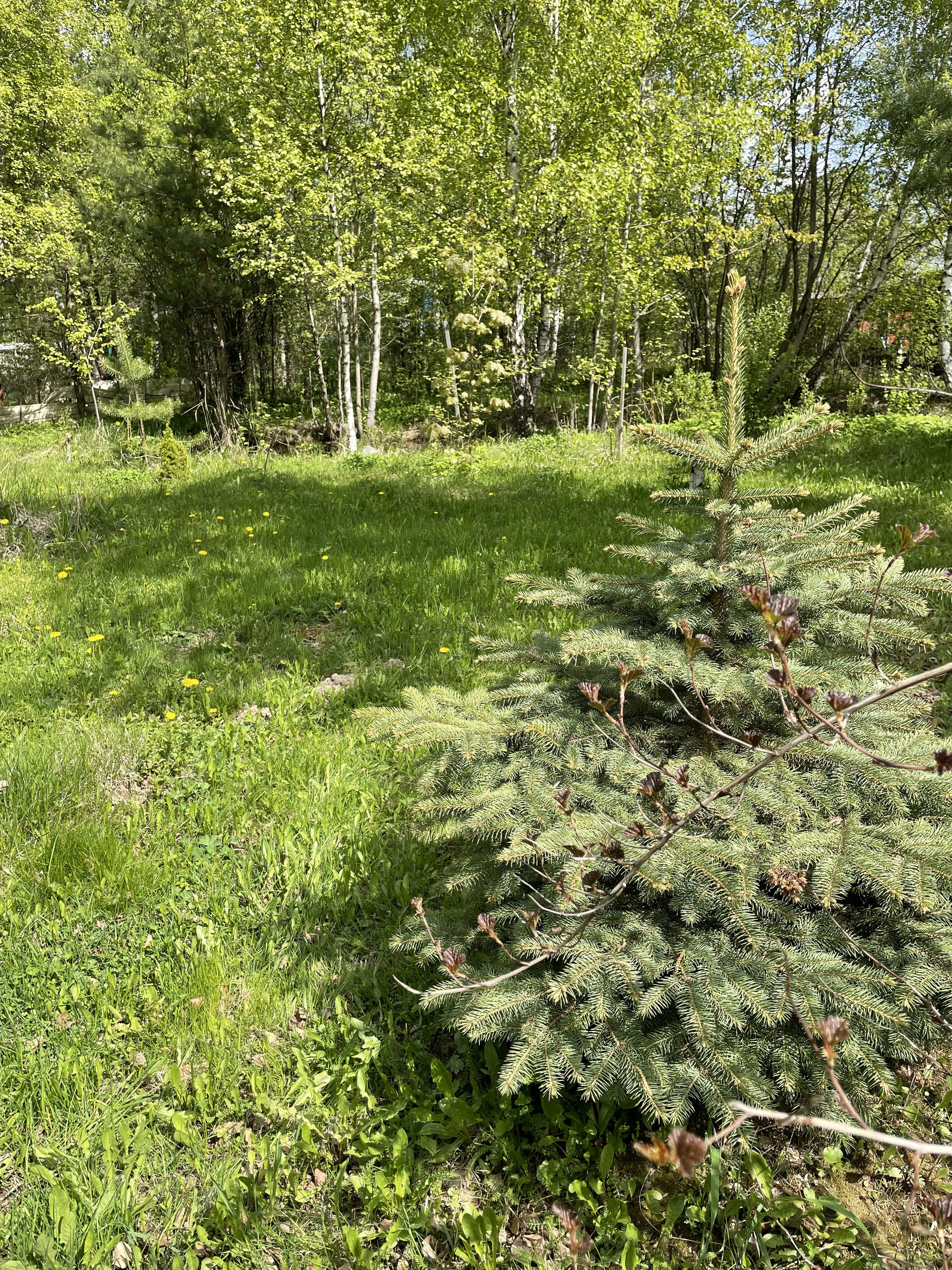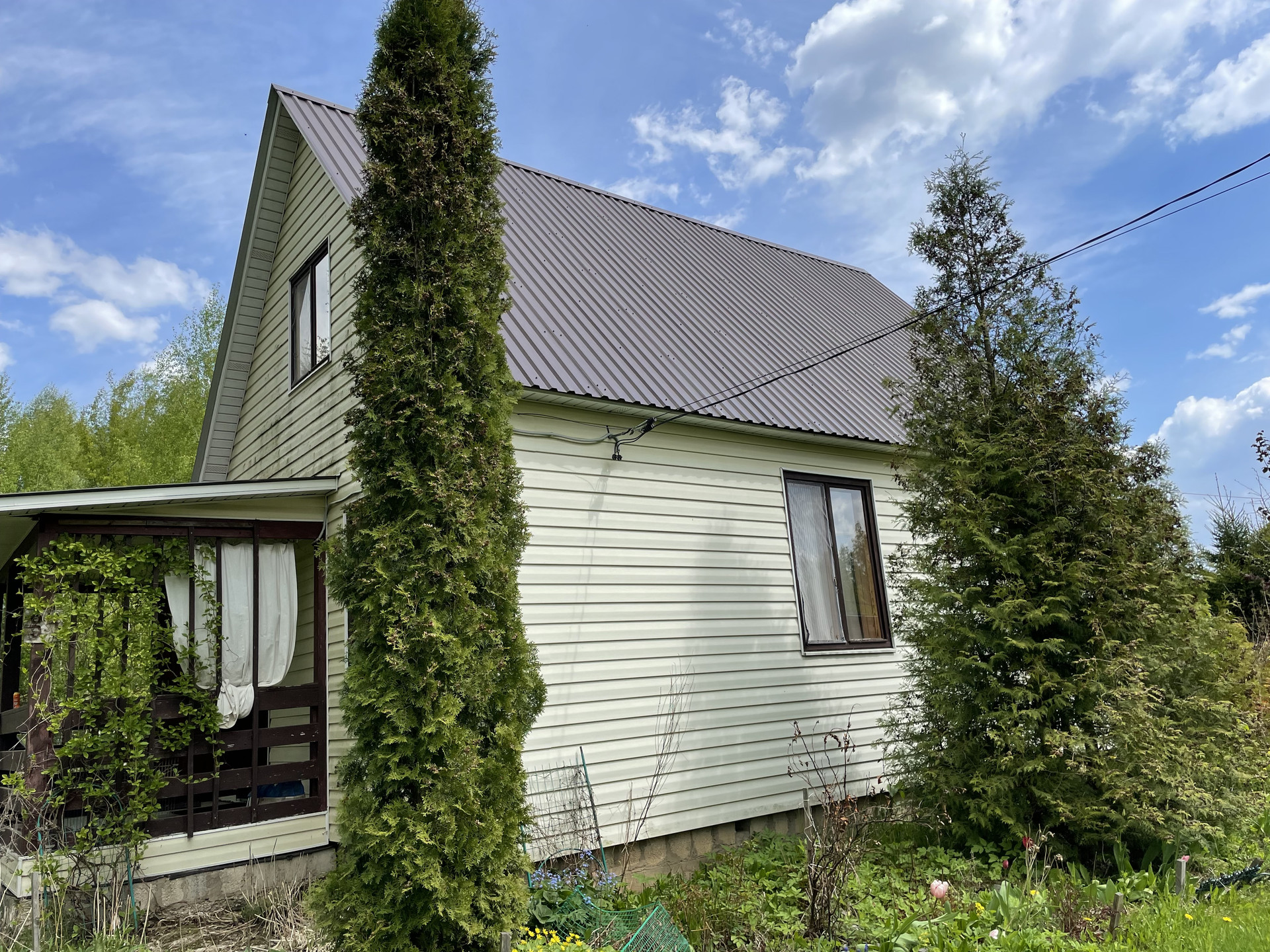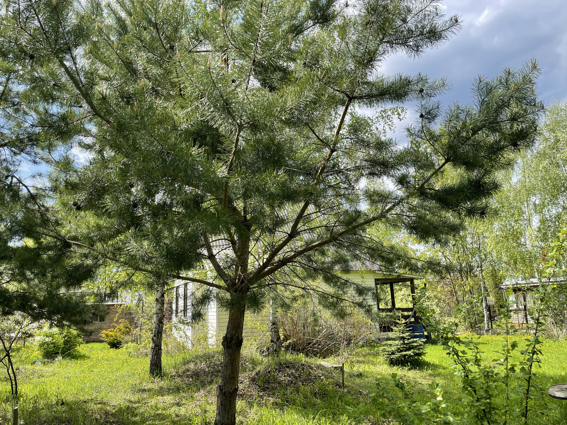 На участке плодовые деревья-яблони, черешни, вишни, орех; плодовые кусты-малина, жимолость, крыжовник. Клубника, земляника. Грядки для помидоров, и для зелени. Посажены хвойники, много цветов. На участке есть пруд с камышами.