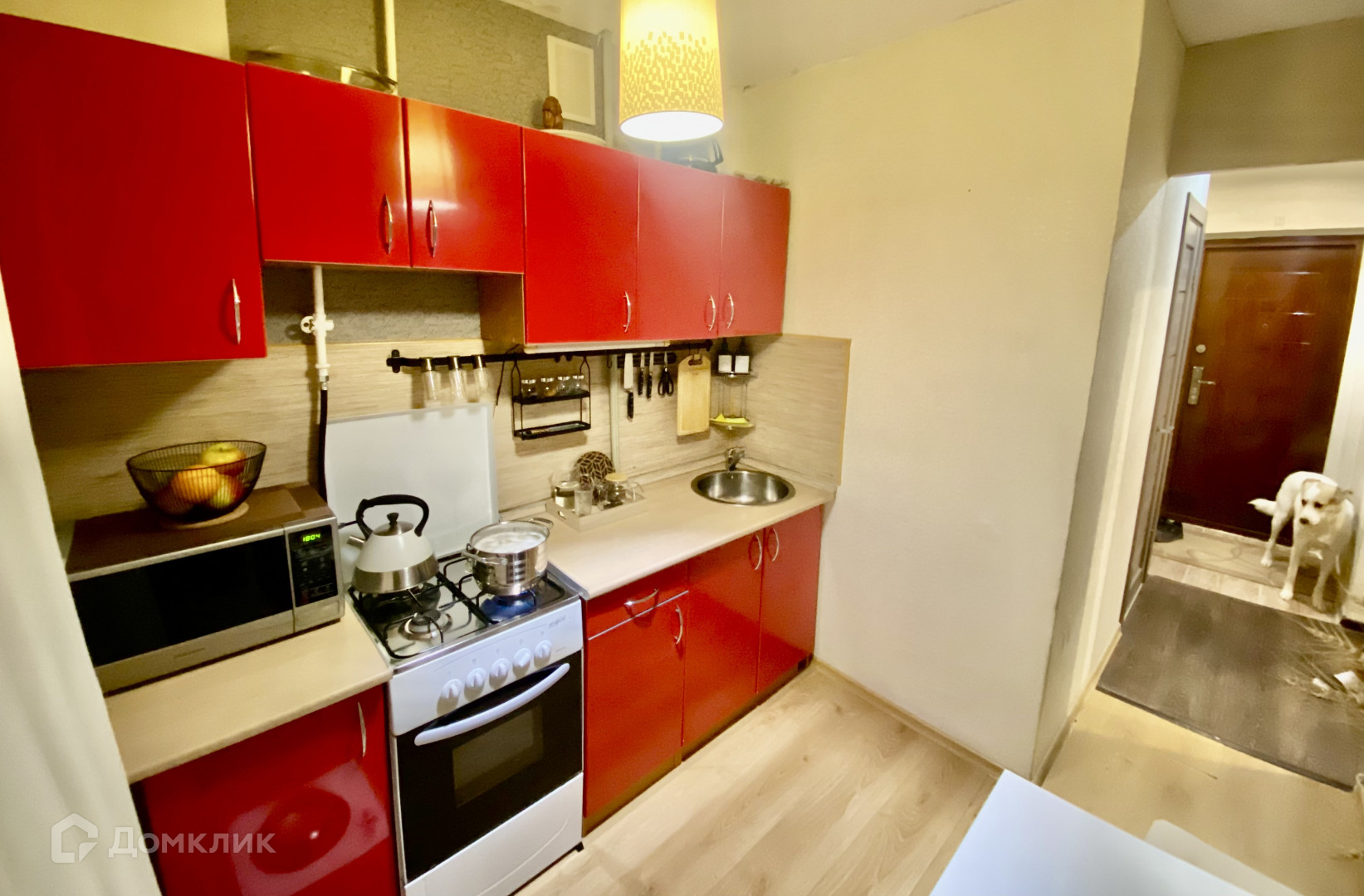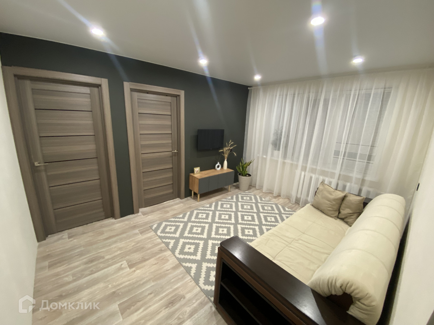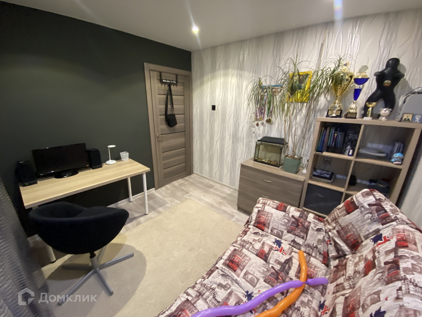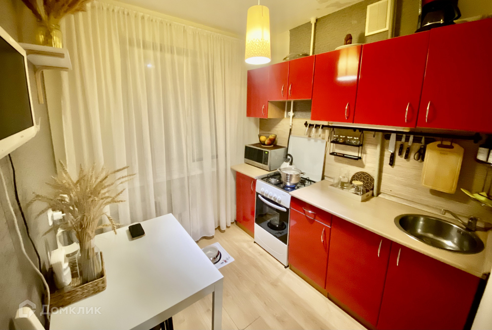В квартире остаётся диван в зале, кухонный гарнитур и телевизор на кухне.