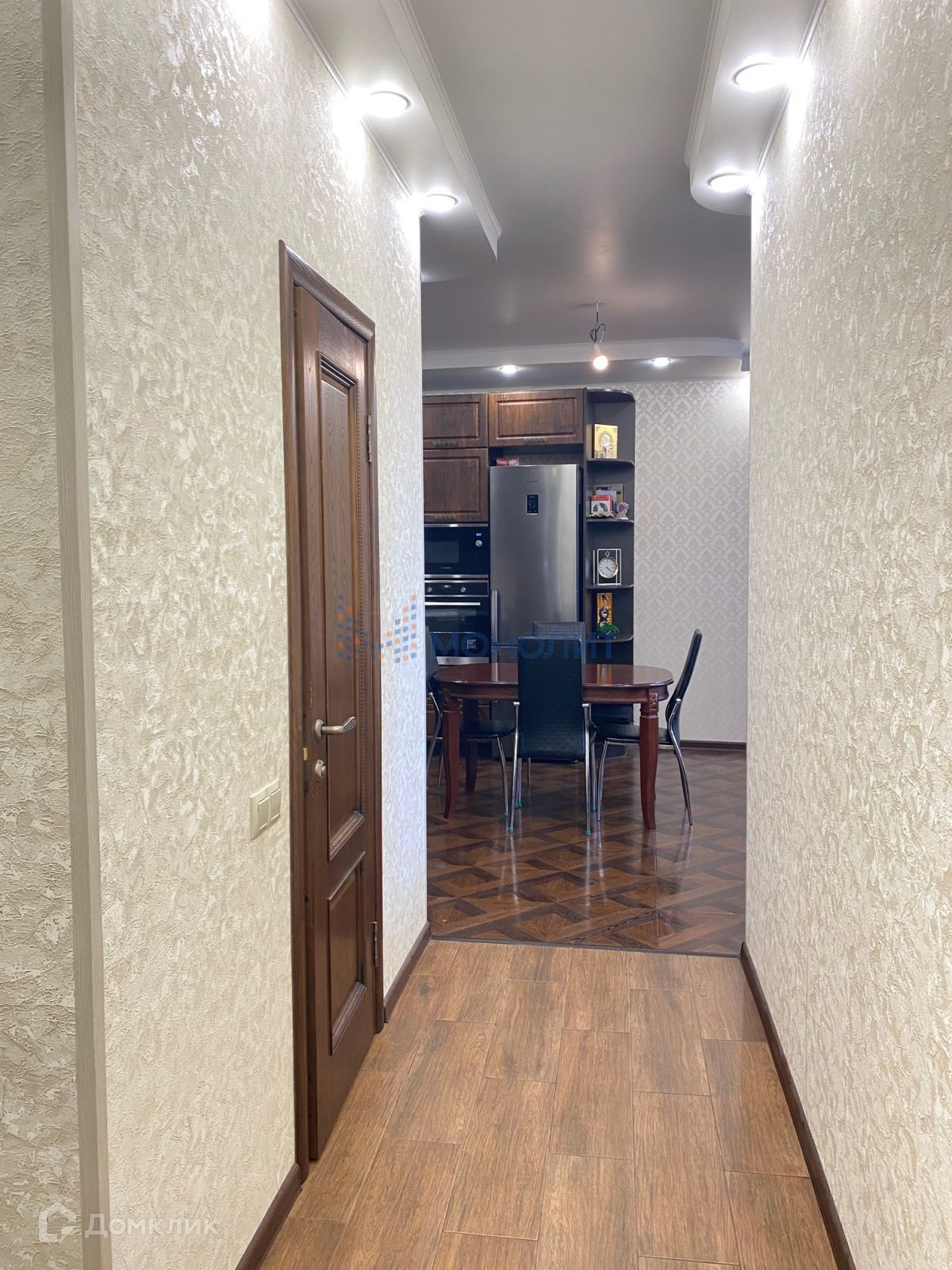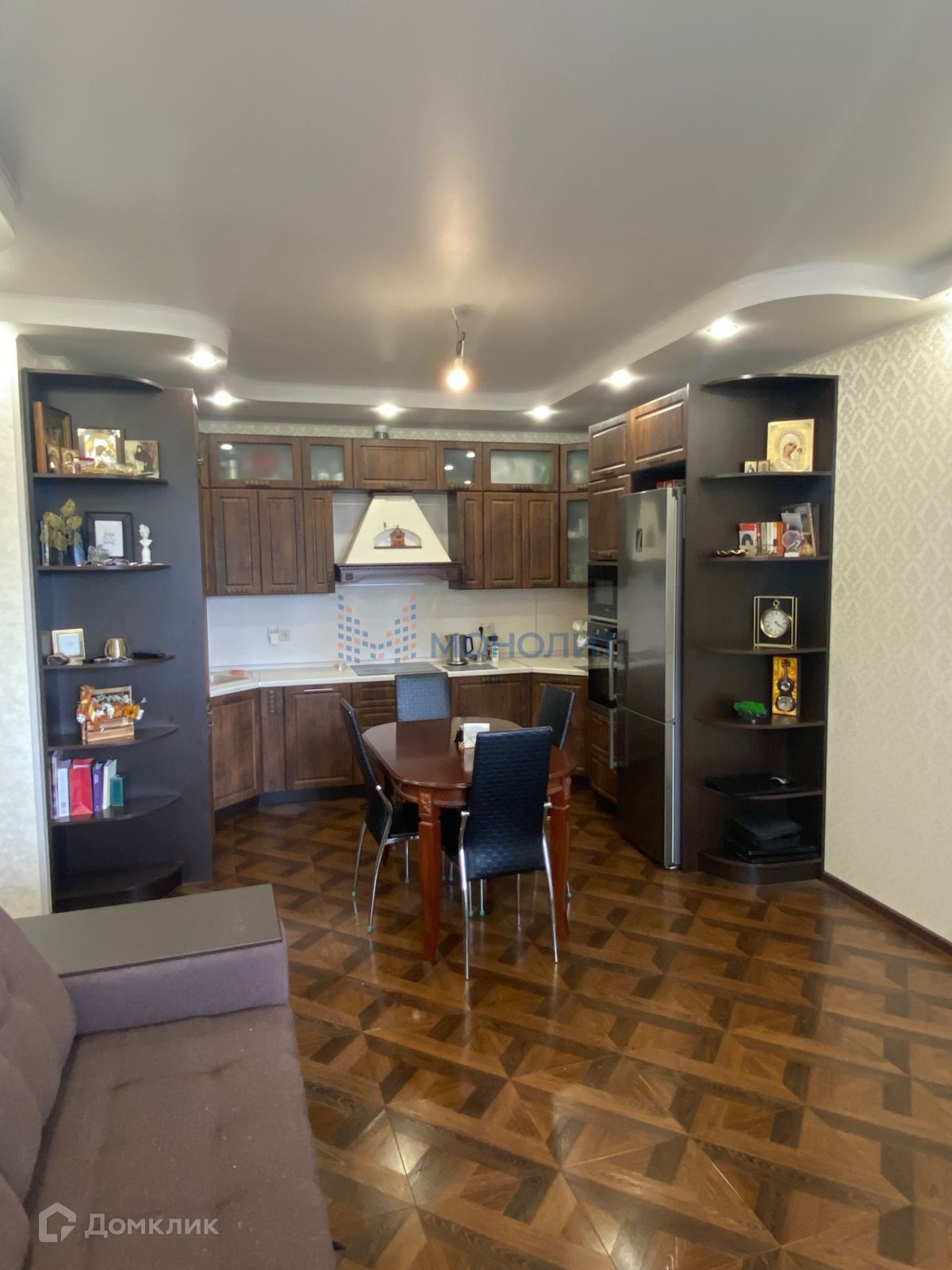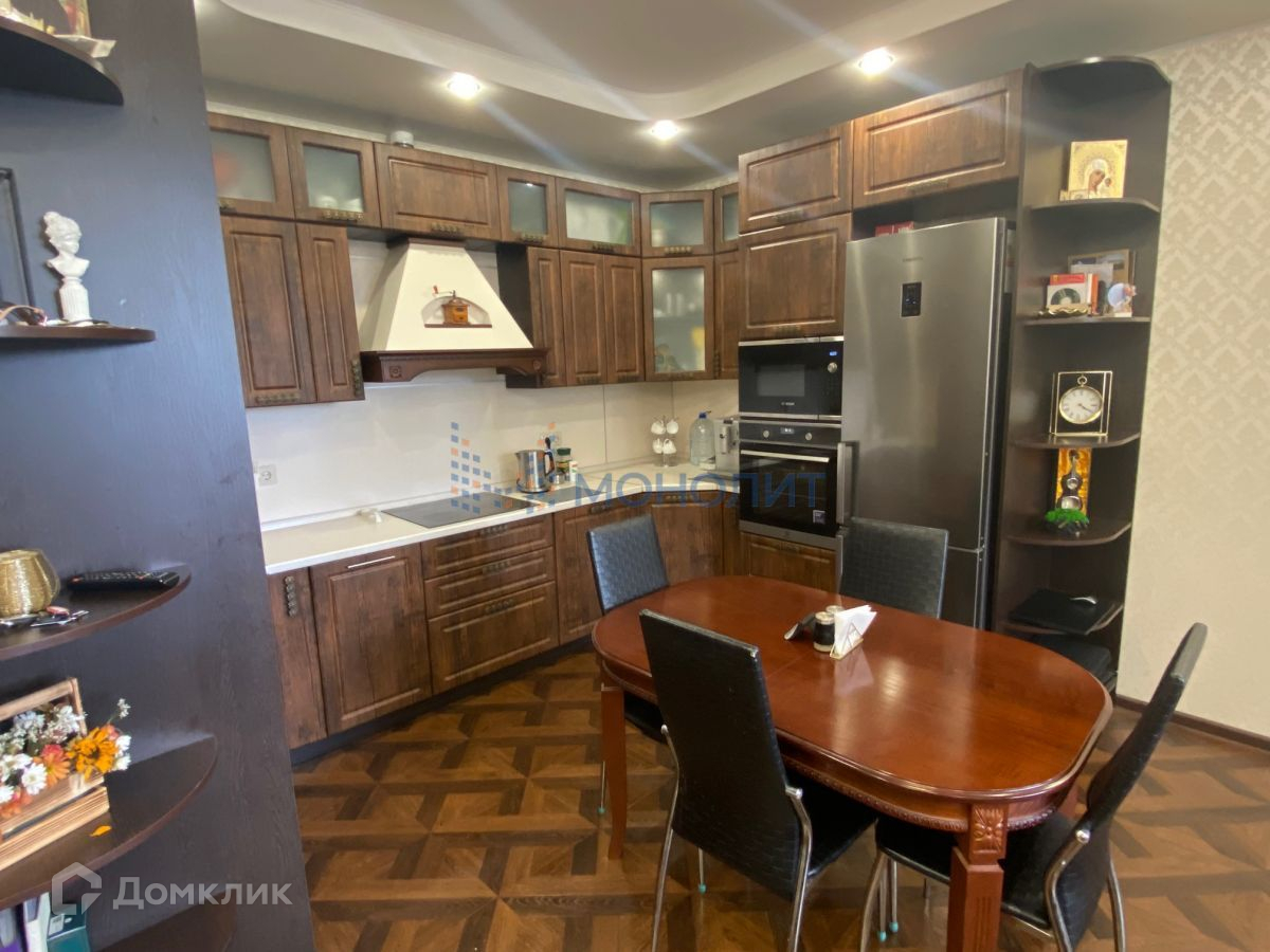 Кухня - гостиная 24 м2 со встроенным гарнитуром. В квартире остается встроенная техника: индукционная плита, встроенная стиральная машина, духовка, микроволновая печь, посудомоечная машина. Выполнен качественный ремонт, квартира покупалась в черновом варианте. Потолок штукатуренный под маяки по всей квартире, конструкции для светильников по всей квартире, в комнатах ламинат толщиной 10 мм. Межкомнатные двери натуральный шпон (ясень) в коридоре и кухне полу плитка.