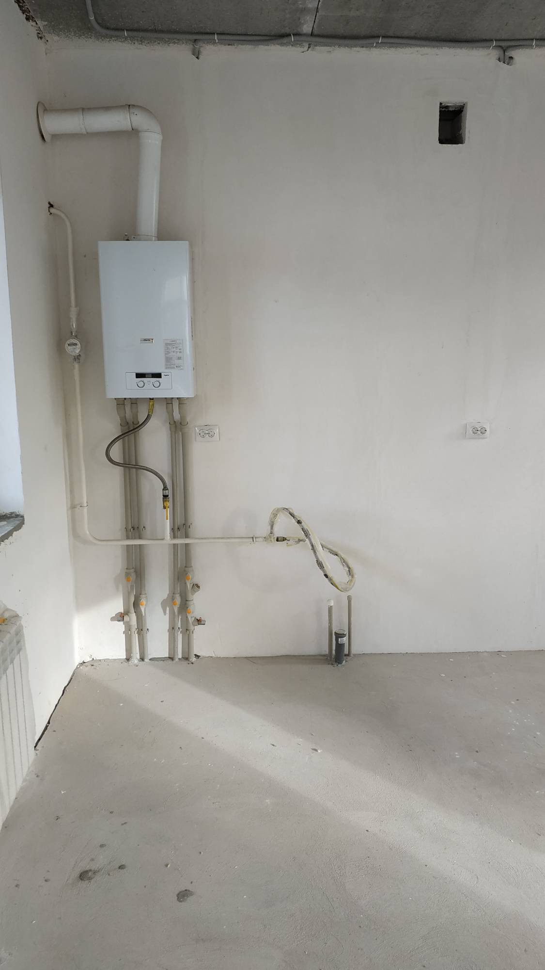Индивидуальный двухконтурный газовый котел, установлены электрический счетчик и счетчики по ХВС, система отопления, электропроводка. Централизованное водоснабжение и канализация.