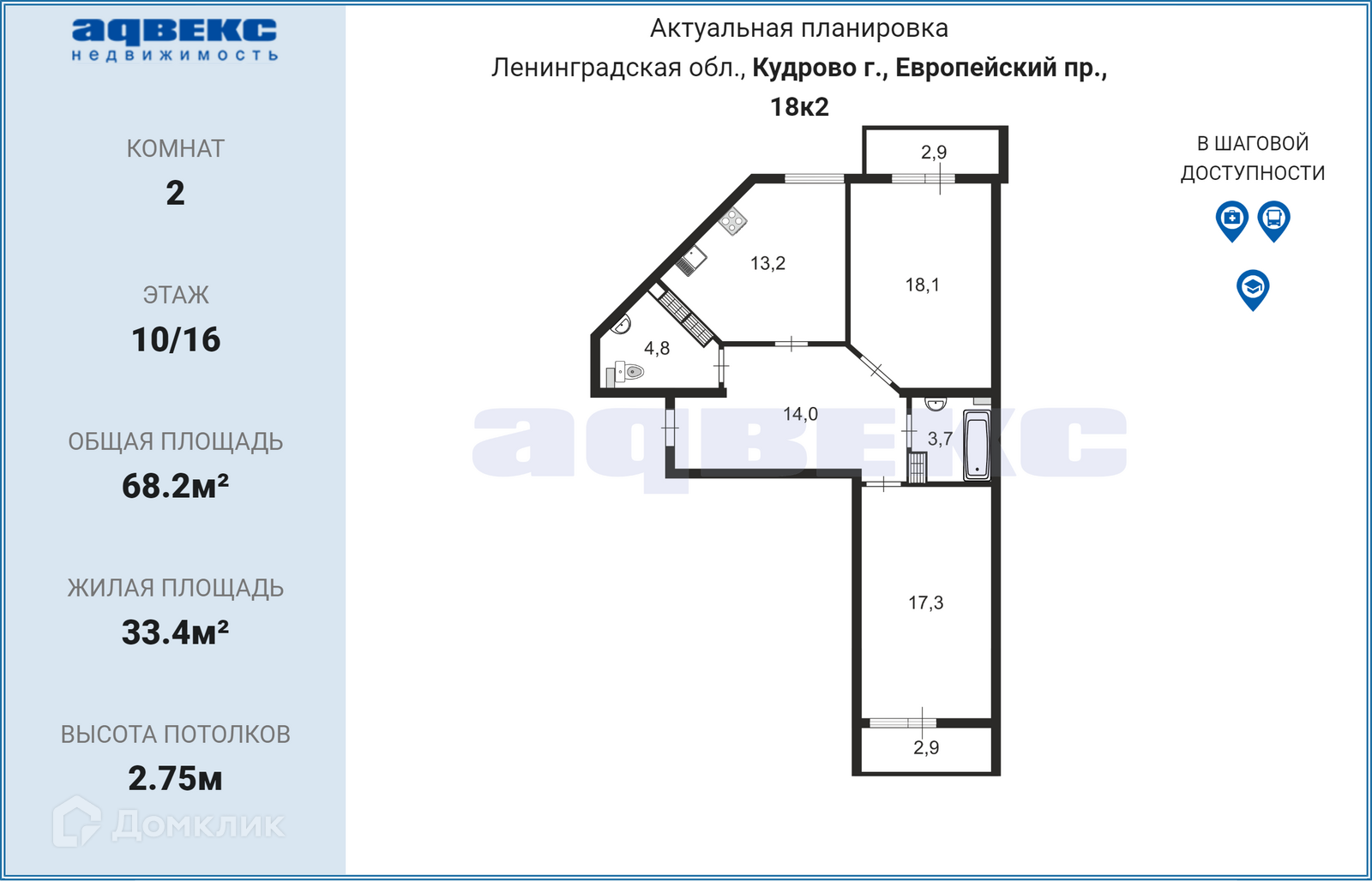 2-комнатная квартира, 71.3 м2, этаж 10 / 16, на продажу в Кудрово, Европейский проспект, 18к2