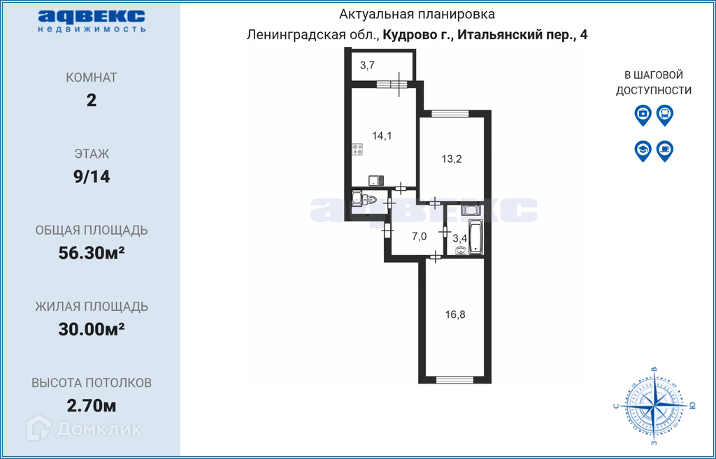 Общая площадь 56.3 м2