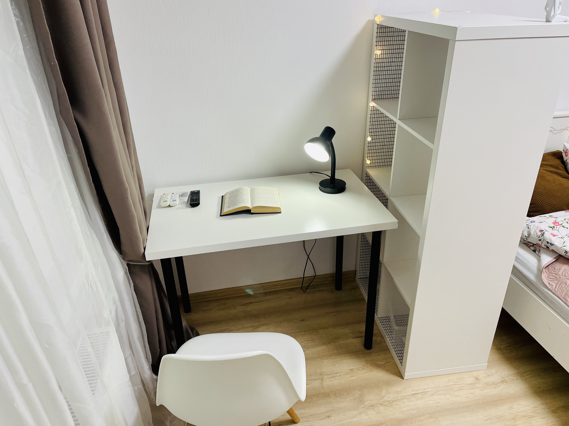 - Стол, два стелажа и стул для полноценного рабочего пространства.