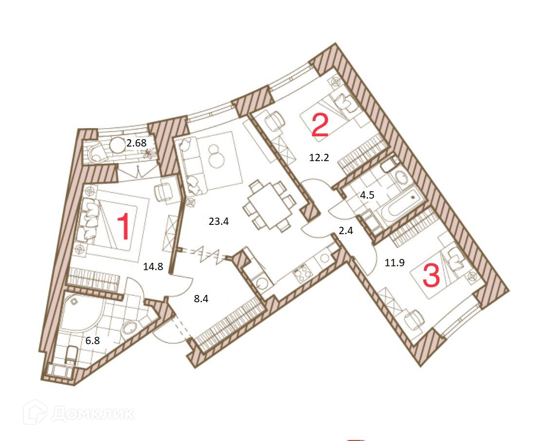 Лучшая планировка в доме, окна квартиры смотрят на две стороны, общая площадь квартиры 84.4 м.кв. плюс застекленная лоджия 2,68 м.кв., при входе большая прихожая 8,4 м.кв., комнаты 11,9 м.кв., 12,2 м.кв. и 14,8 м.кв., два санузла 4,5 м.кв. и 6,8 м.кв., а также большая кухня-гостиная 23,4 м.кв., потолки высотой 2,75 м.