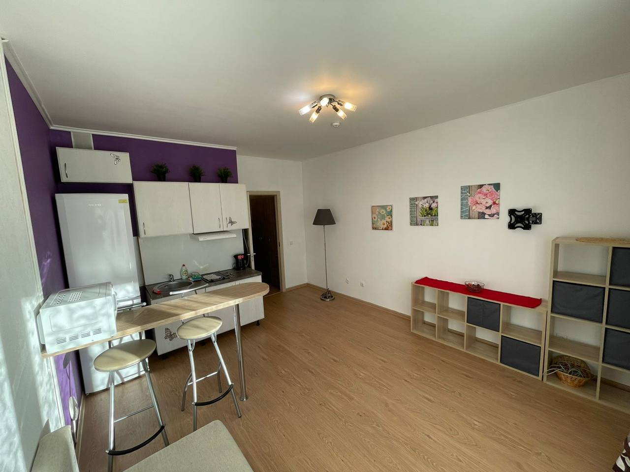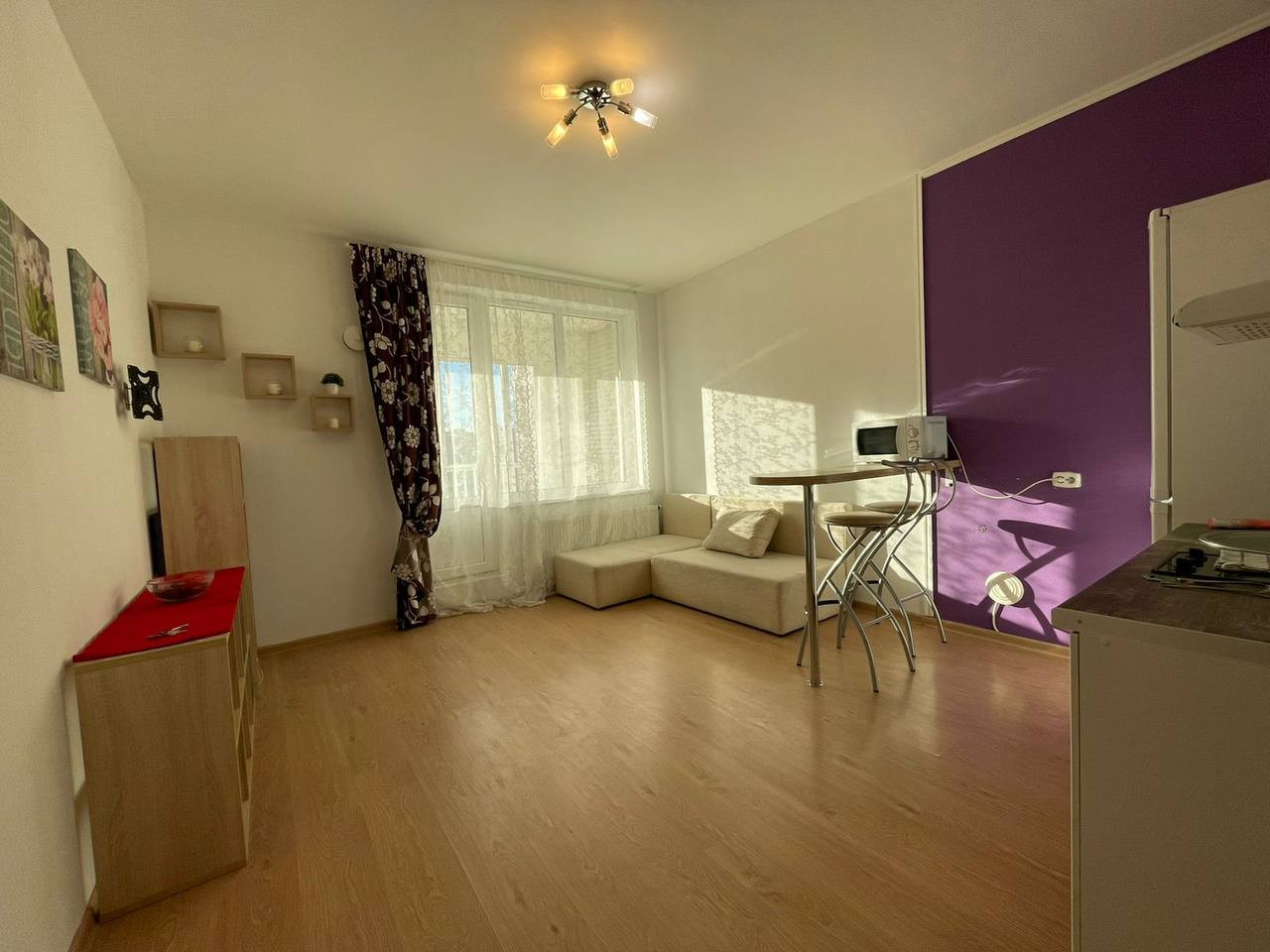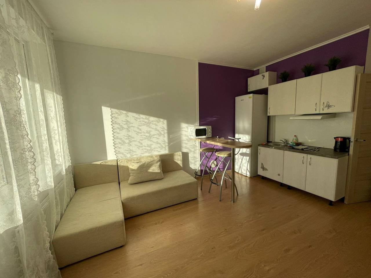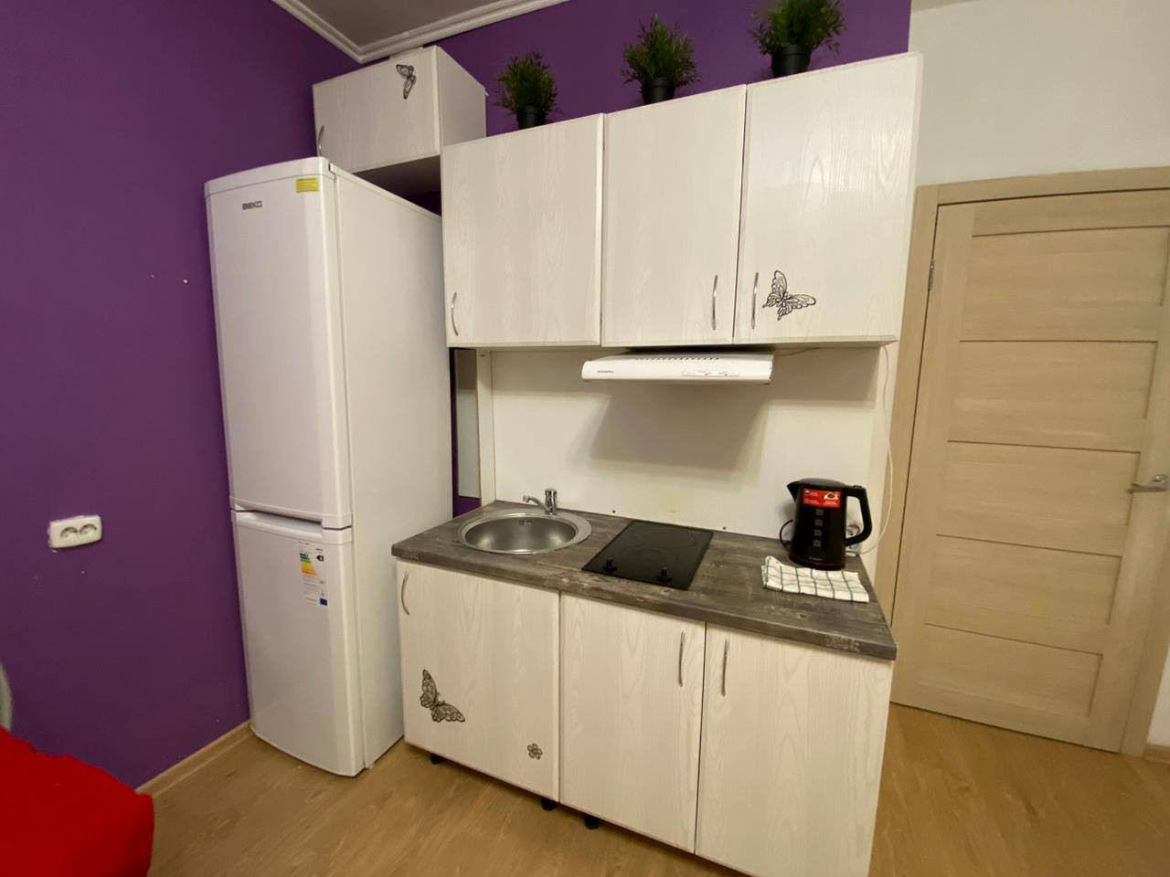 Квартира-студия полностью оснащена всем необходимым: кухней с варочной панелью, вытяжкой, стиральной машиной, холодильником, чайником, посудой и мебелью. Ванная комната выполнена в светлых тонах.