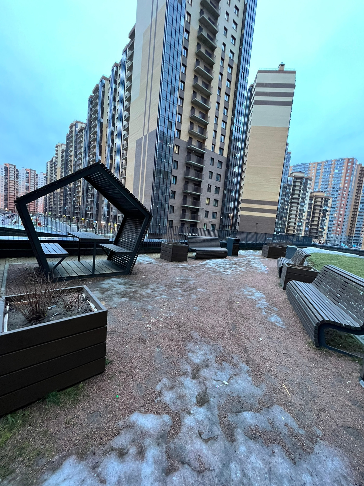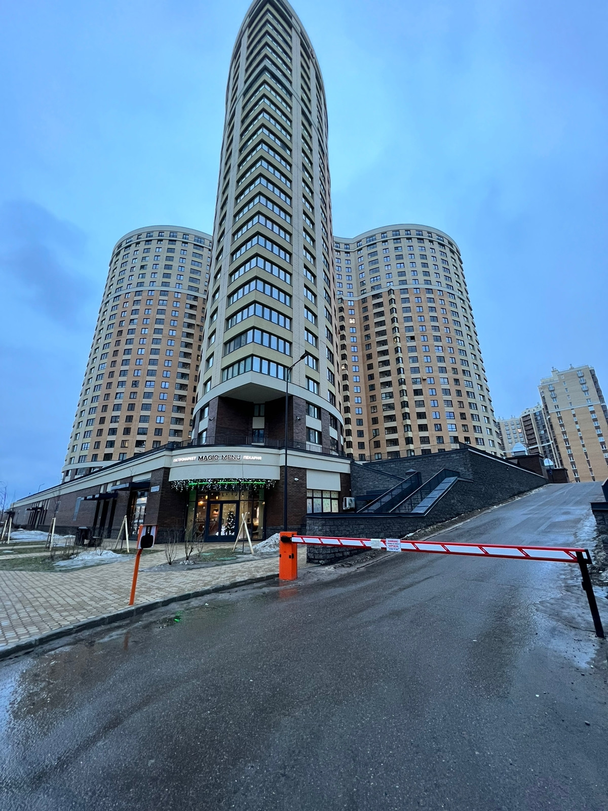 Двор без машин, закрыт шлагбаумом, оборудован местами для отдыха. Кроме паркинга вокруг дома много открытых гостевых парковочных мест. Рядом с домом есть аллея с детскими и спортивными площадками, скамейками и фонтаном.