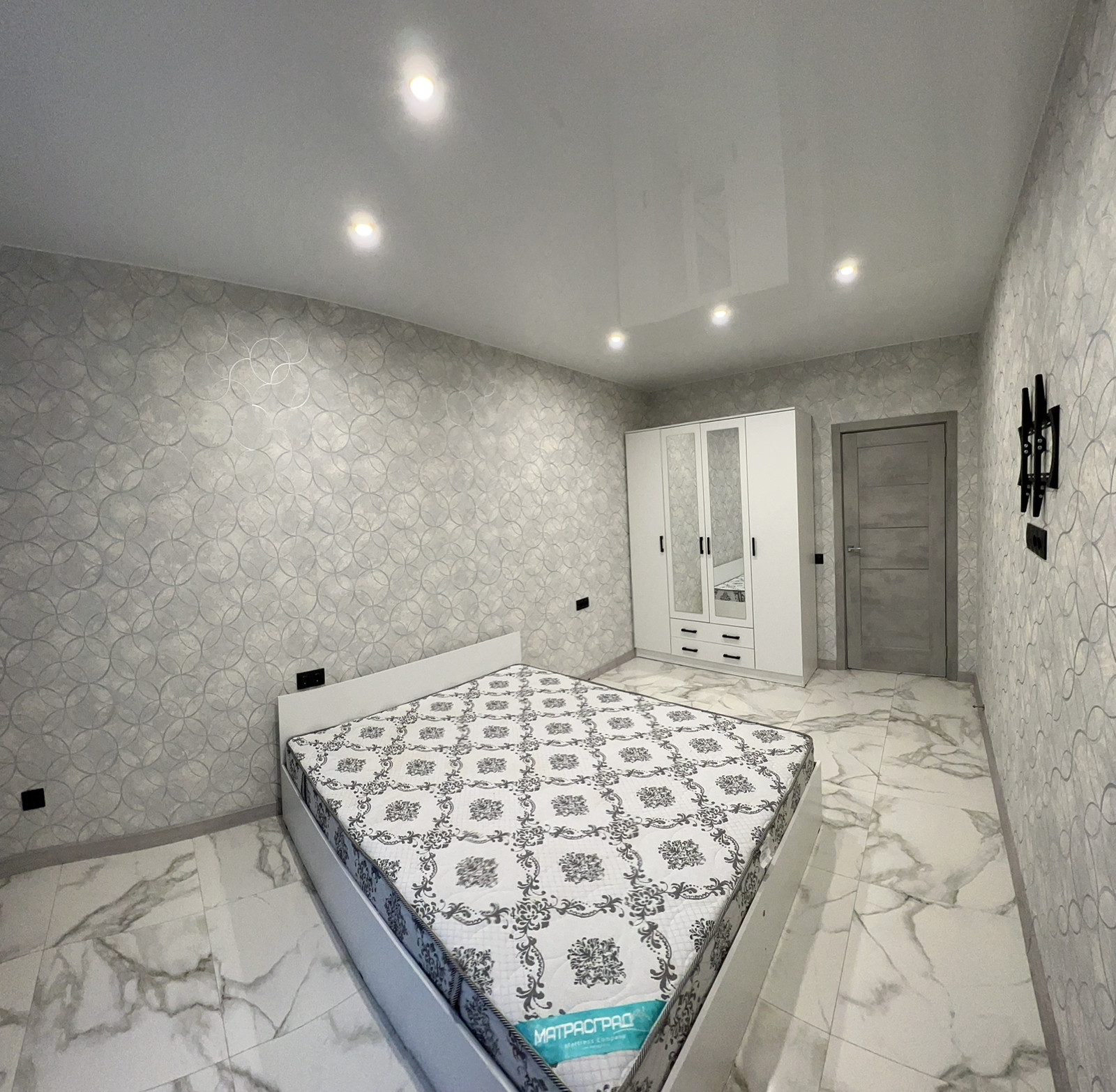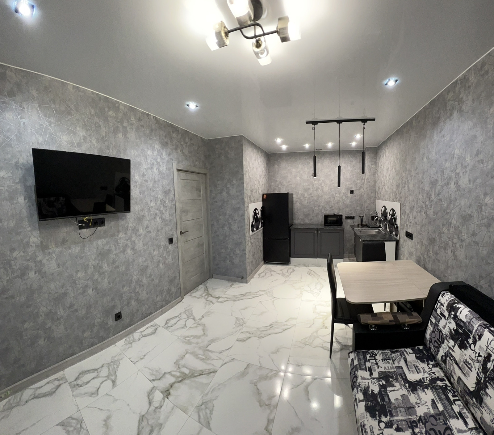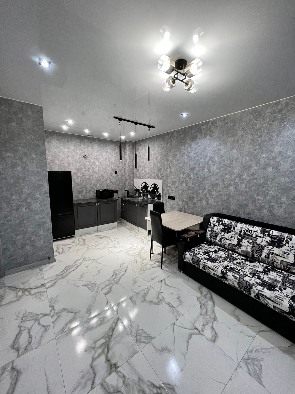 - везде натяжные потолки с зонированием освещения;