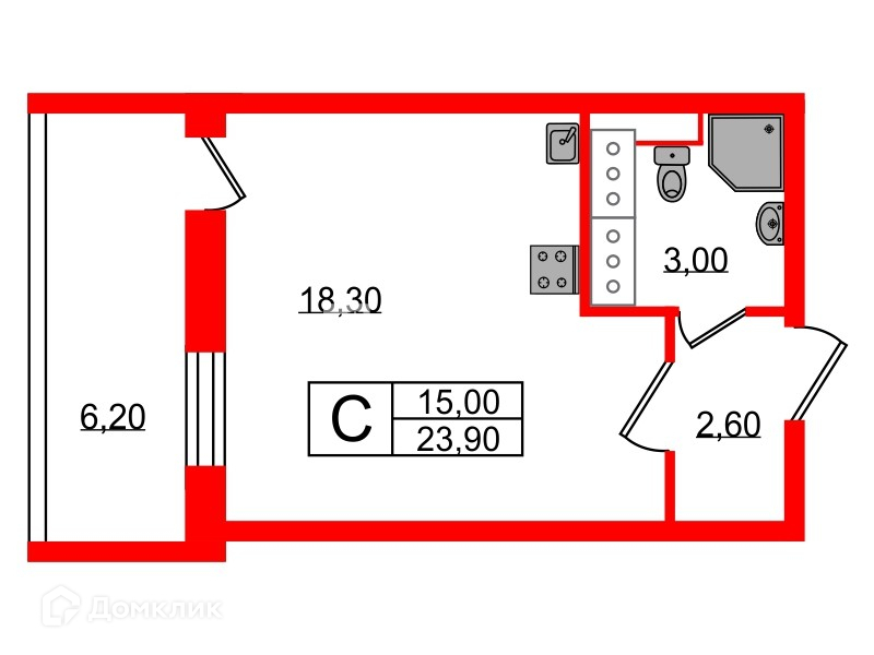 Общая площадь 23.9 м2
