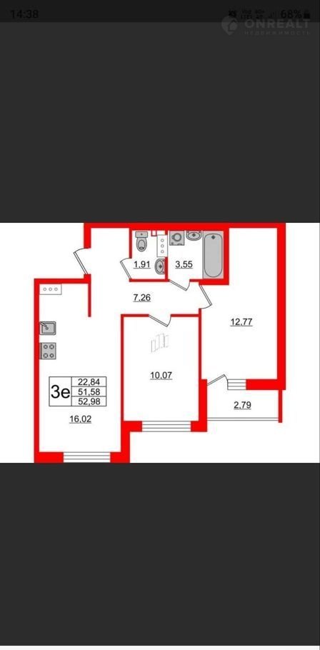 2-комнатная квартира, 53 м2, этаж 3 / 12, на продажу в Кудрово, проспект Строителей, 5к1