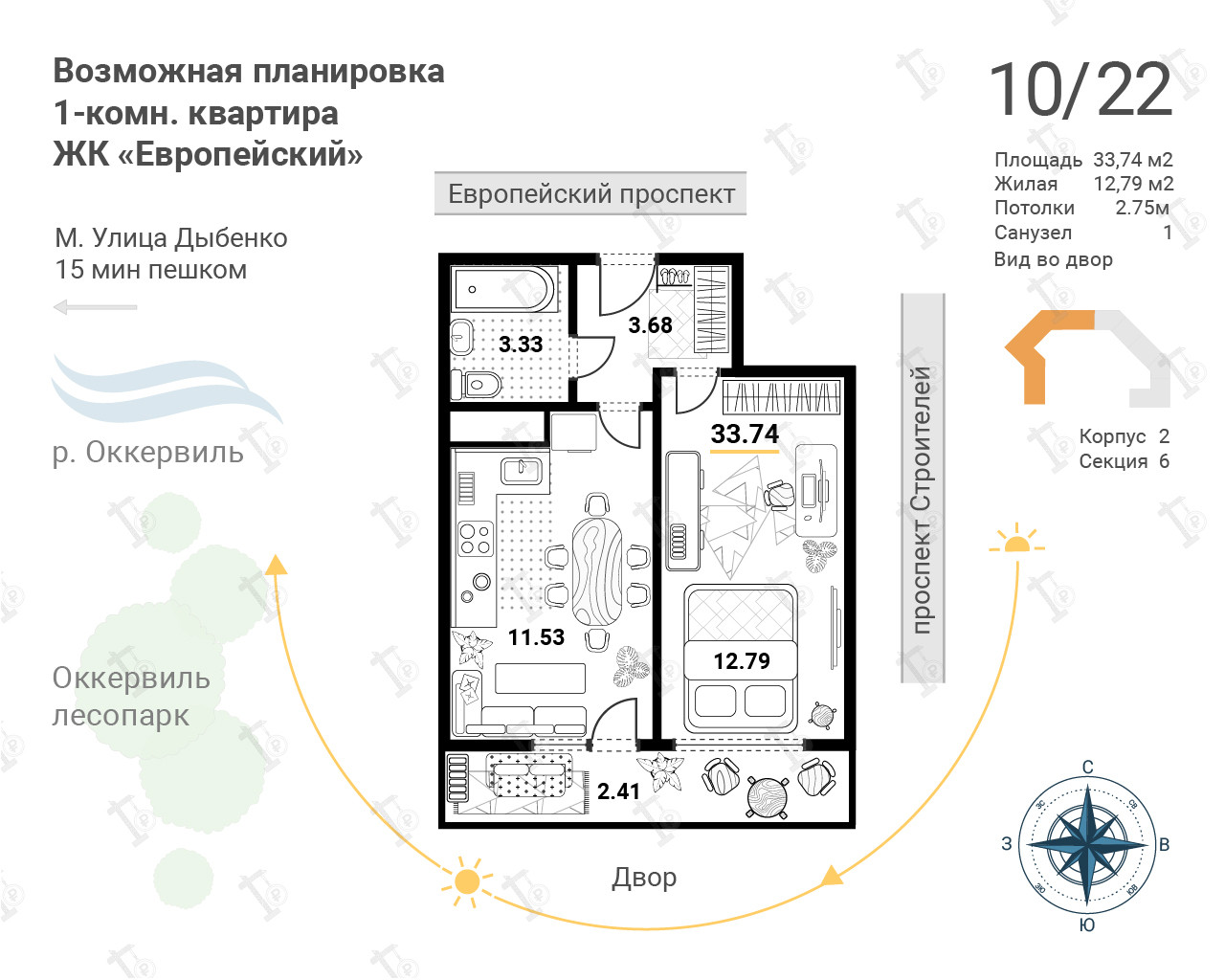 1-комнатная квартира, 33.74 м2, этаж 10 / 22, на продажу в Кудрово, Европейский проспект, 22