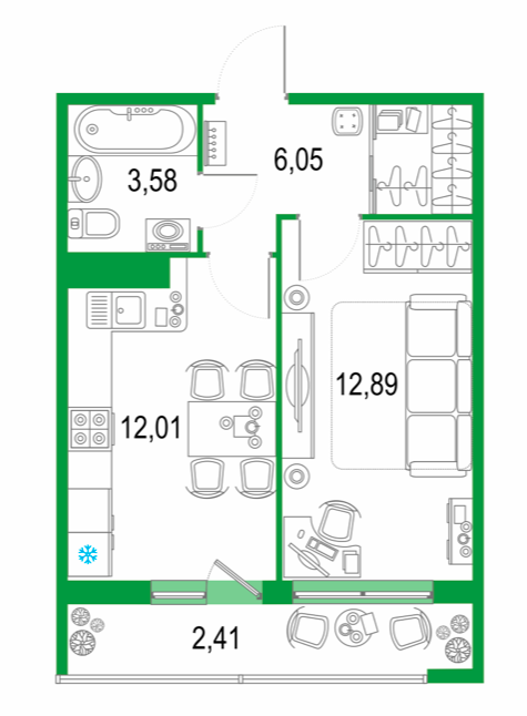 Жилая площадь 12.89 м2