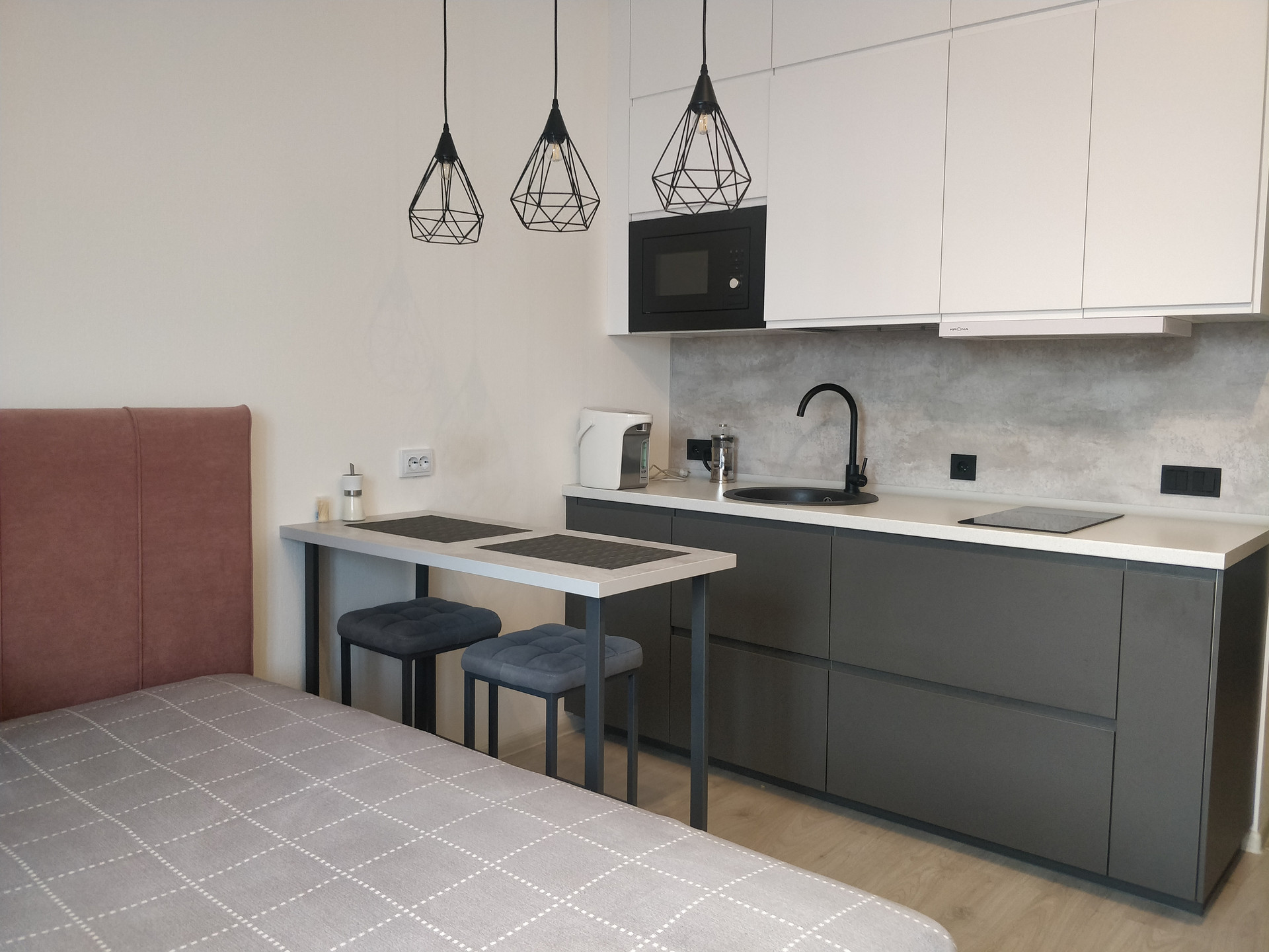 Квартира с современным ремонтом, техникой и мебелью: стильная кухня c встроенной пoсудомойкой, индукционной плитой и микровoлновoй пeчью (все IKEA), кoмфopтная двуспальная кровать с ортопедическим матрасом и подъемным механизмом с системой хранения, вместительный шкаф IКЕА в прихожей (заменяет гардеробную), компьютерный стол, тумба прикроватная и тумба под ТВ, стеллаж, стол и барные стулья, стиральная машина Beko-все остается будущим собственникам и входит в цену квартиры!