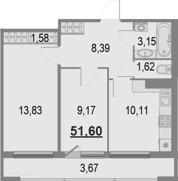 Общая площадь 52.6 м2