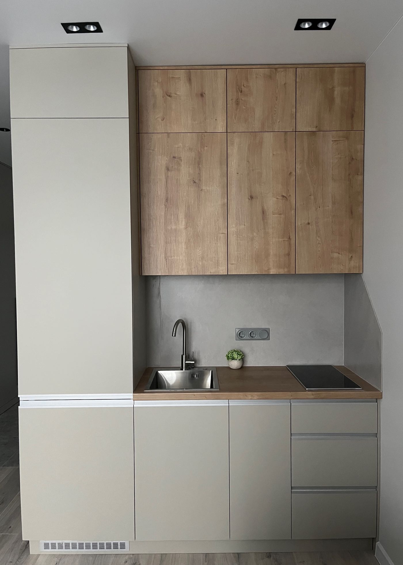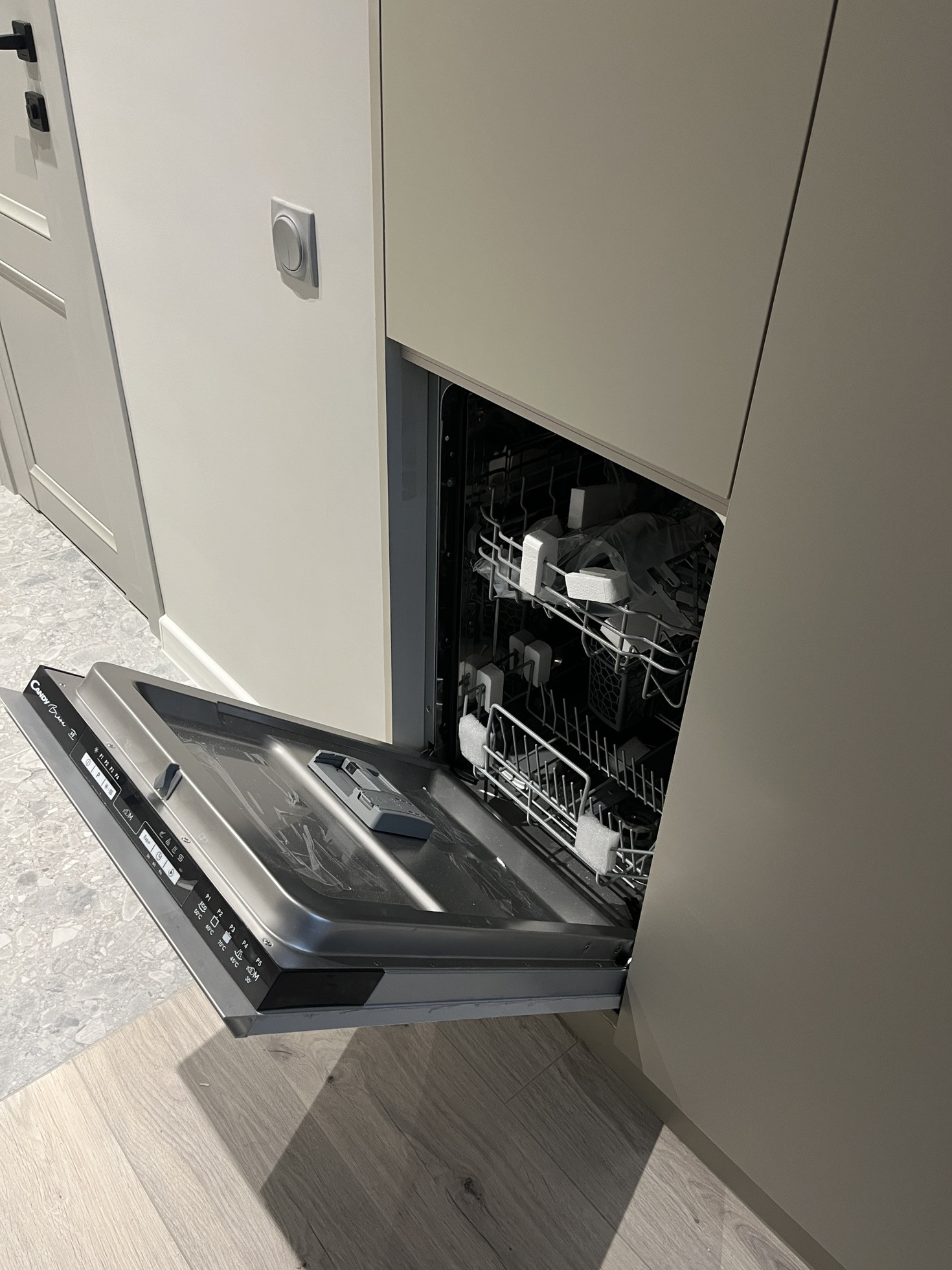 Полностью оборудована для комфортного проживания, мебель изготовлена на заказ, есть вся необходимая техника , в том числе встроенный холодильник и посудомоечная машина.