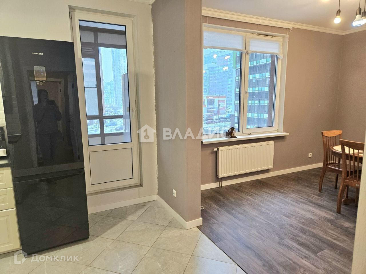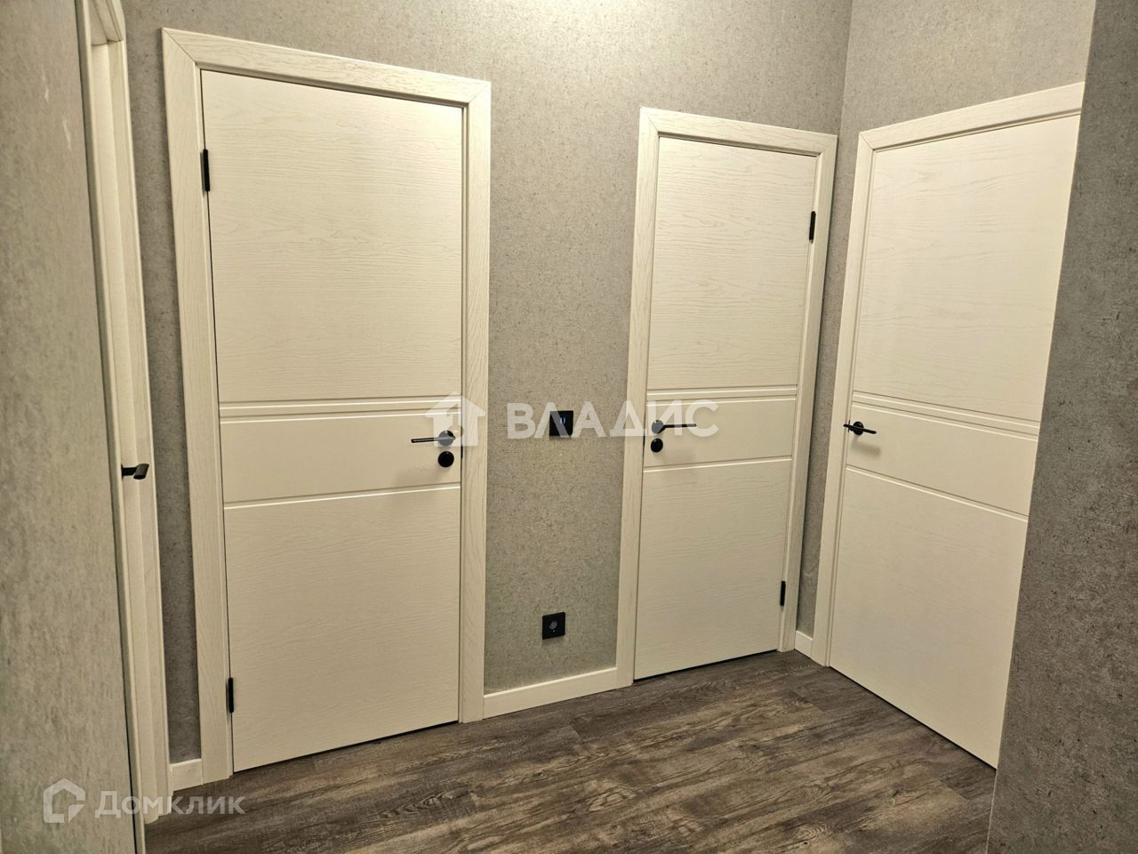 Пол на кухни тёплый в кафеле. В комнатах и коридоре на полу кварцвинил, двери - качественные, окрашенный шпон.