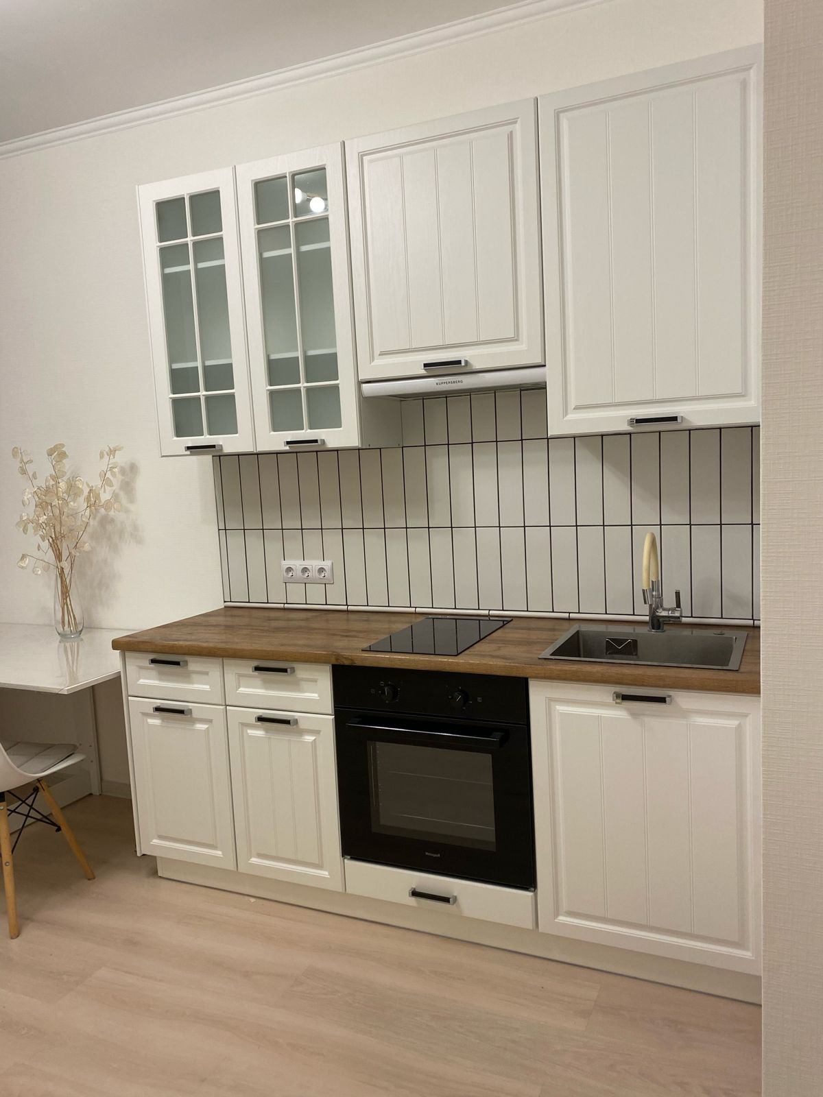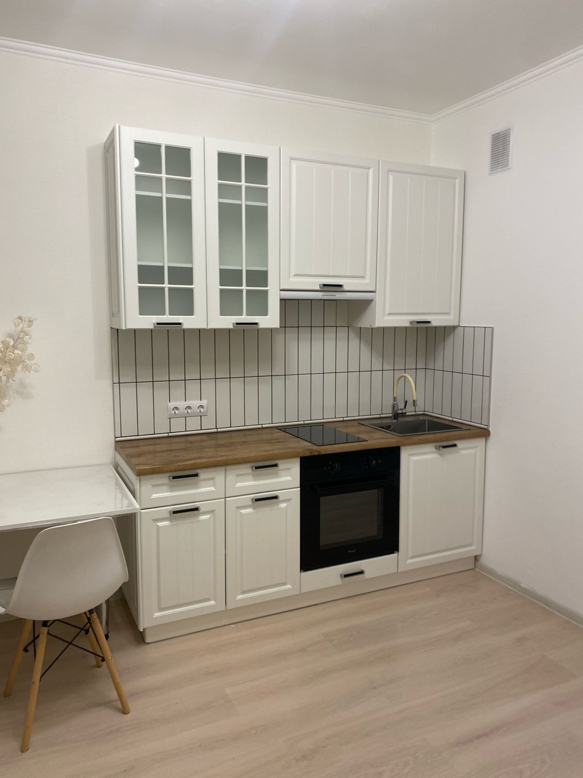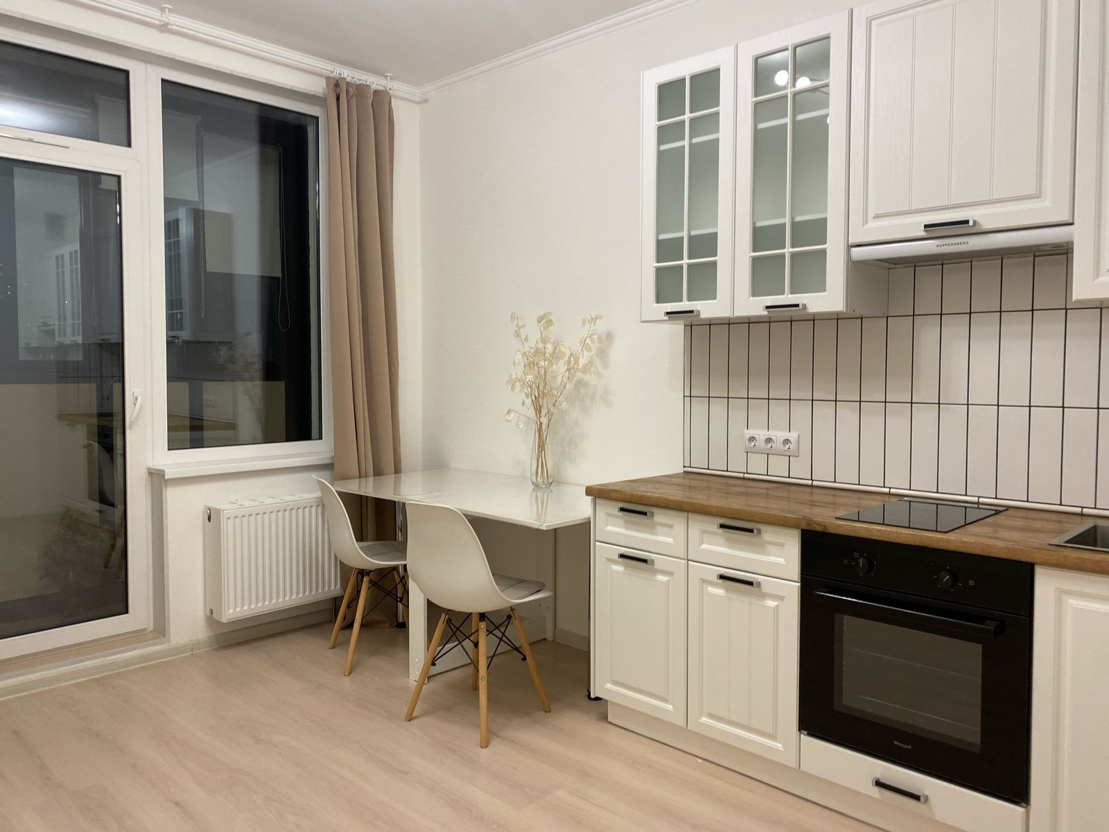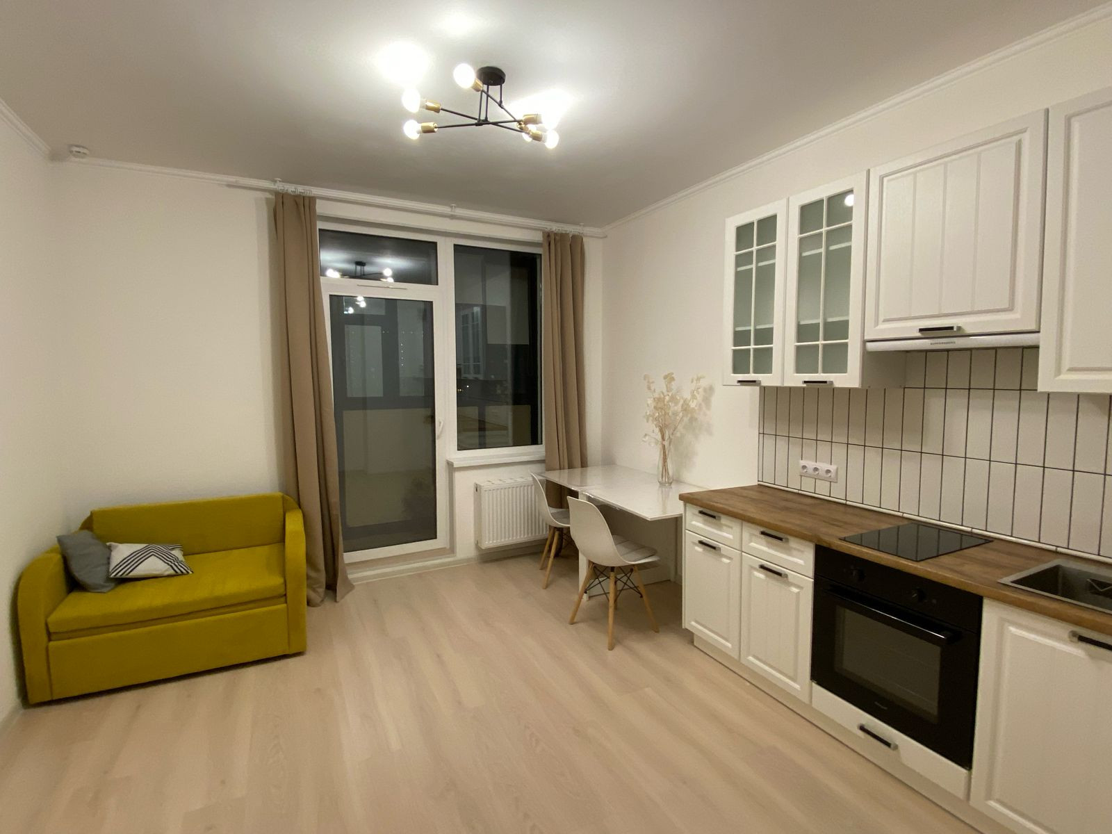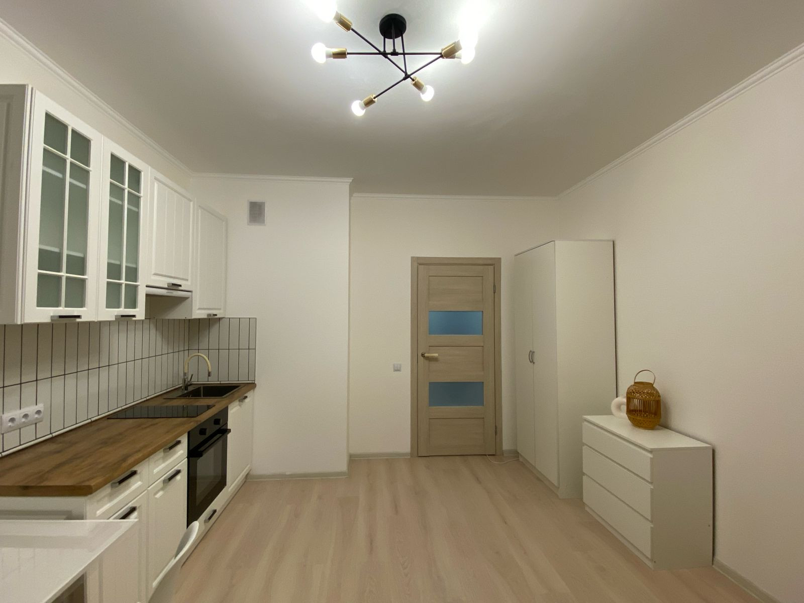 Также в квартире присутствует вся необходимая техника и мебель - кухня на заказ с встроенной варочной панелью, духовым шкафом и вытяжкой; холодильник, стиральная машина, шкафы, диван, стол и стулья, комод.