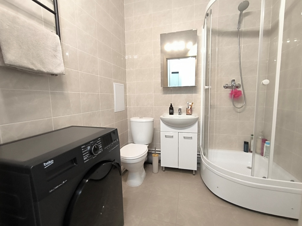 О КВАРТИРЕ: Современная студия, с удачной планировкой. Жить в ней очень удобно и комфортно: правильная широкая форма, жилая зона практически квадратная, что позволяет не ограничиваться при выборе стилевого решения и расстановки мебели, застекленная лоджия с благоустроенными полами, довольно просторная прихожая позволяющая установить большой шкаф для хранения вещей, очень большой совмещенный санузел с местом для сушки вещей и установки стиральной машинки, душевая кабинка, любители, вместо нее могут при желании установить ванну, благо площадь позволяет.
