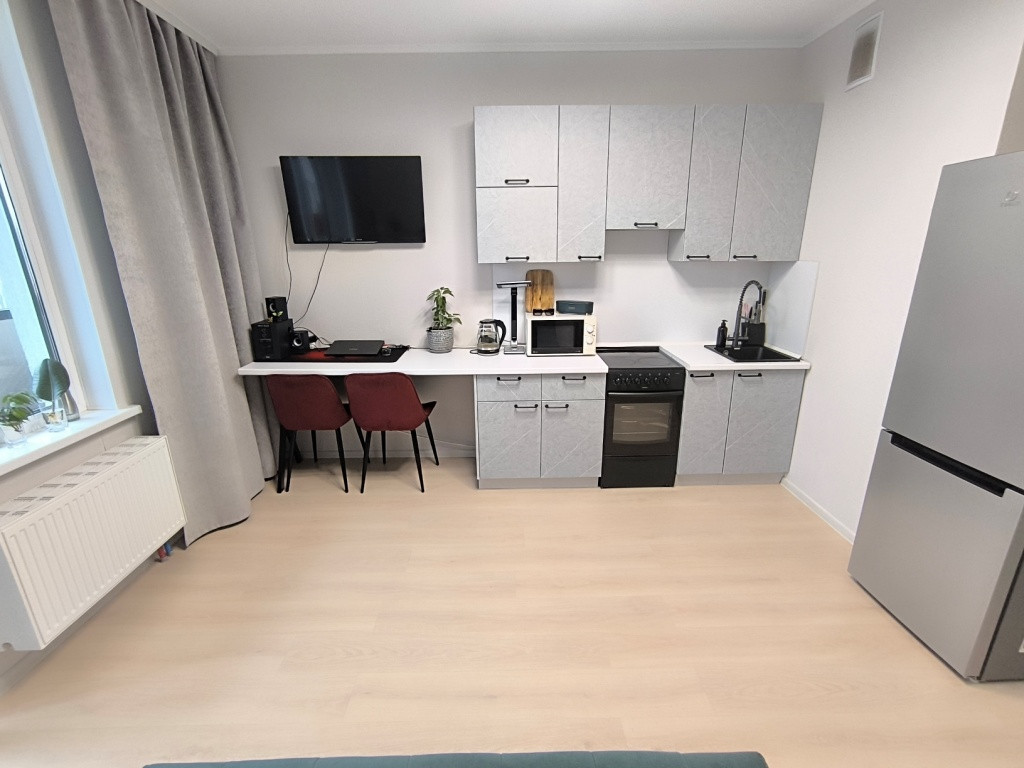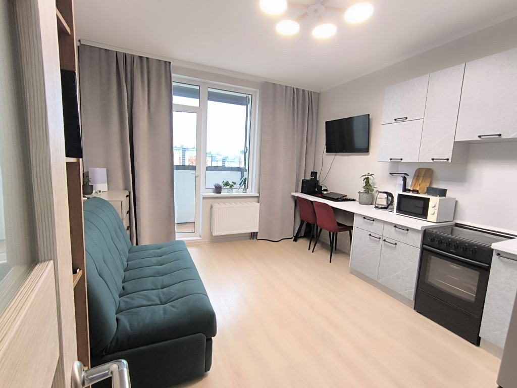 Окна во двор, с потрясающим видом на закаты и панораму города. И что, очень важно, перед вашими окнами никогда не будет близко стоять другой дом с эффектом «окна в окна», так как под окнами квартиры уже построен детский сад. Площадь студии 24,3м2, без учета лоджии 22.7м2, жилая 15,1м2. Высокие потолки 2,75м. Этаж 16/22.