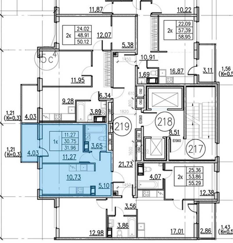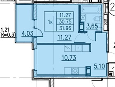 - Площадь квартиры с учетом приведенной площади балкона 32 м2. Общая площадь квартиры 30,7 м2.