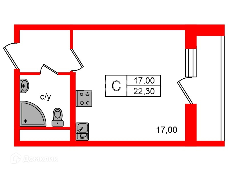 Общая площадь 22.3 м2
