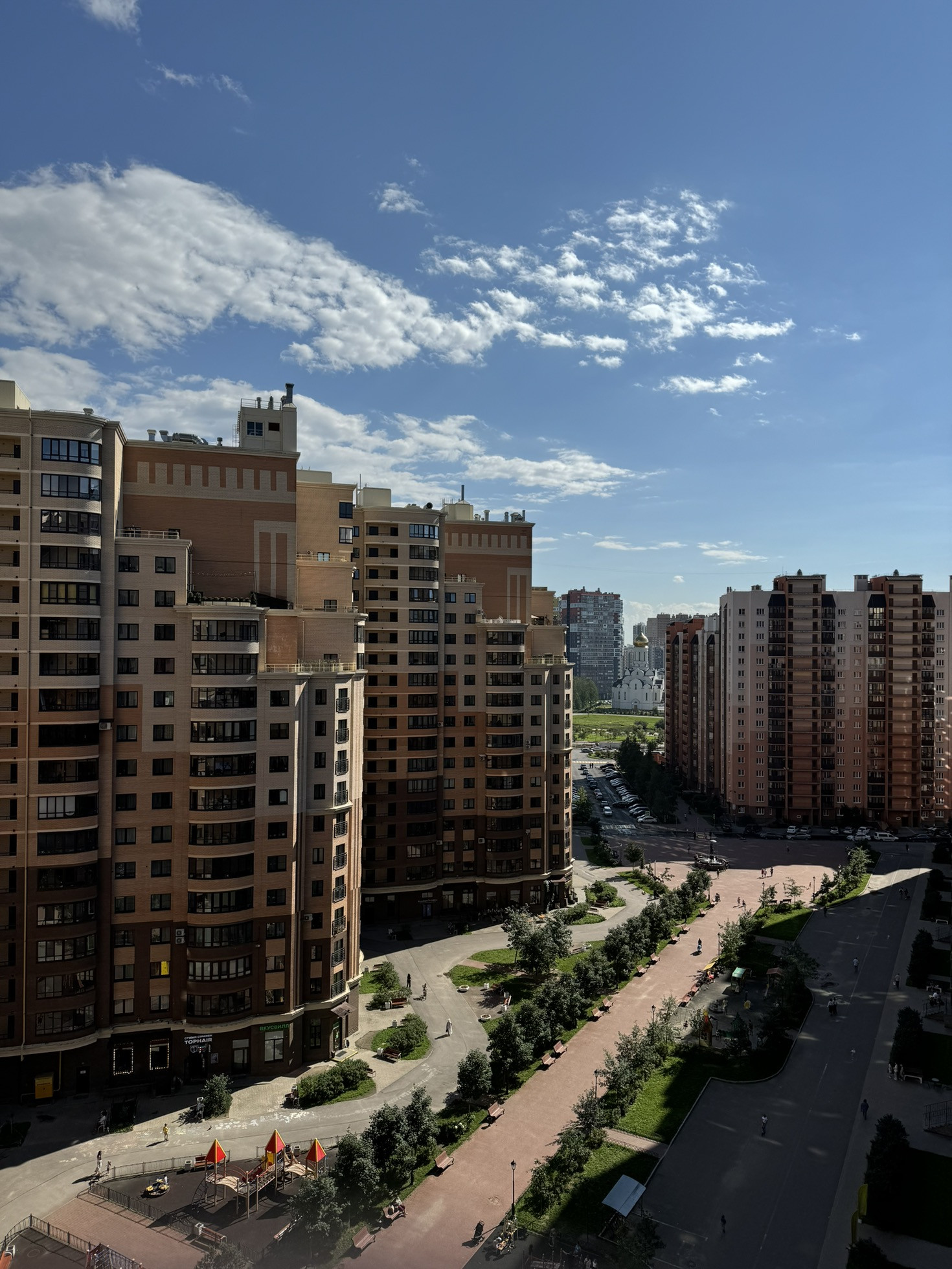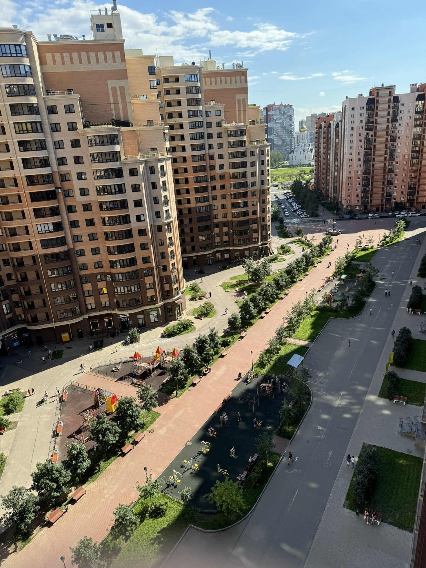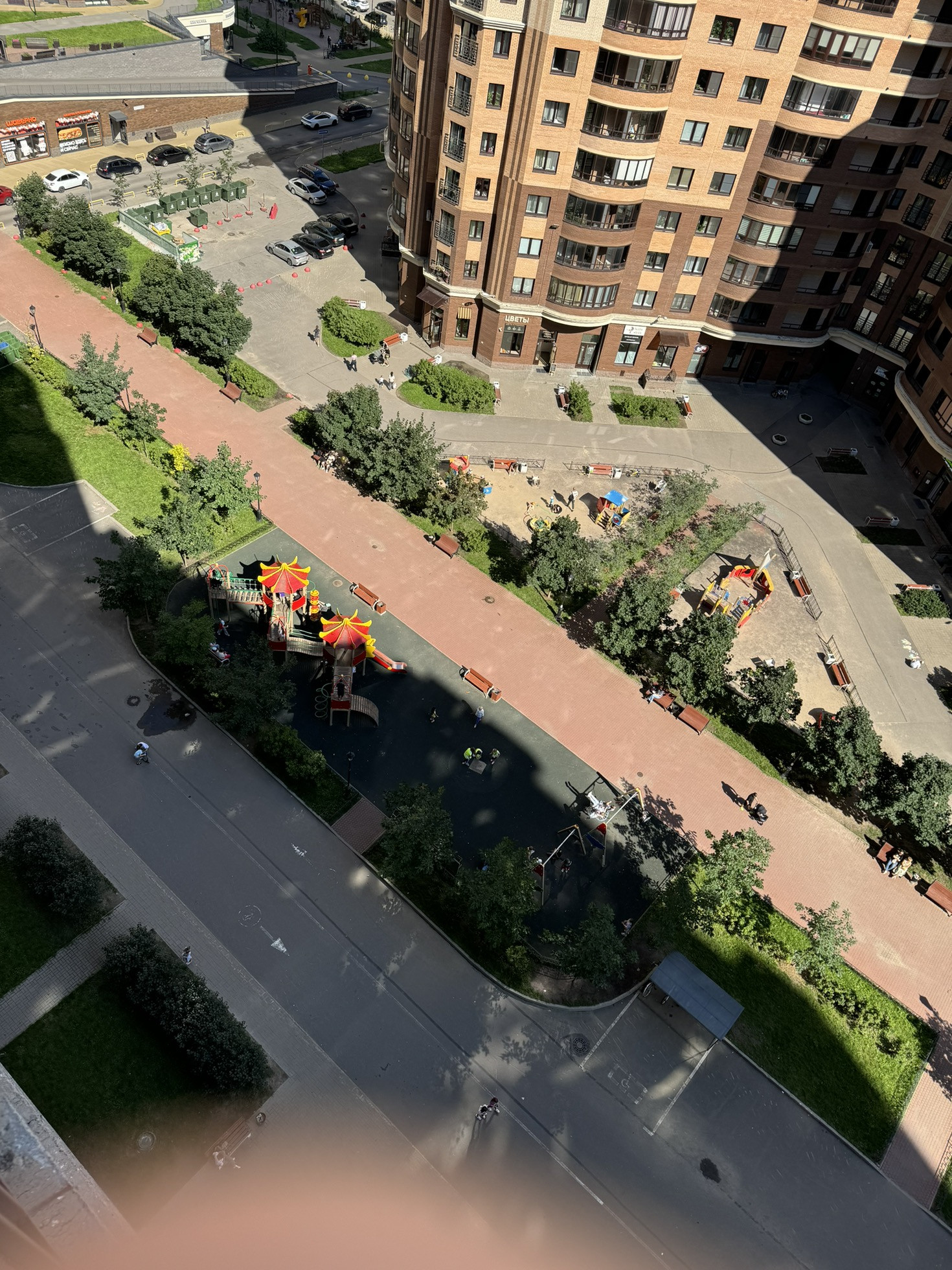 Большое количество магазинов, кафе, аптек, парикмахерских и прочего, во дворе красивый фонтан и каштановая аллея.