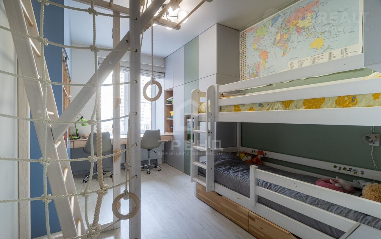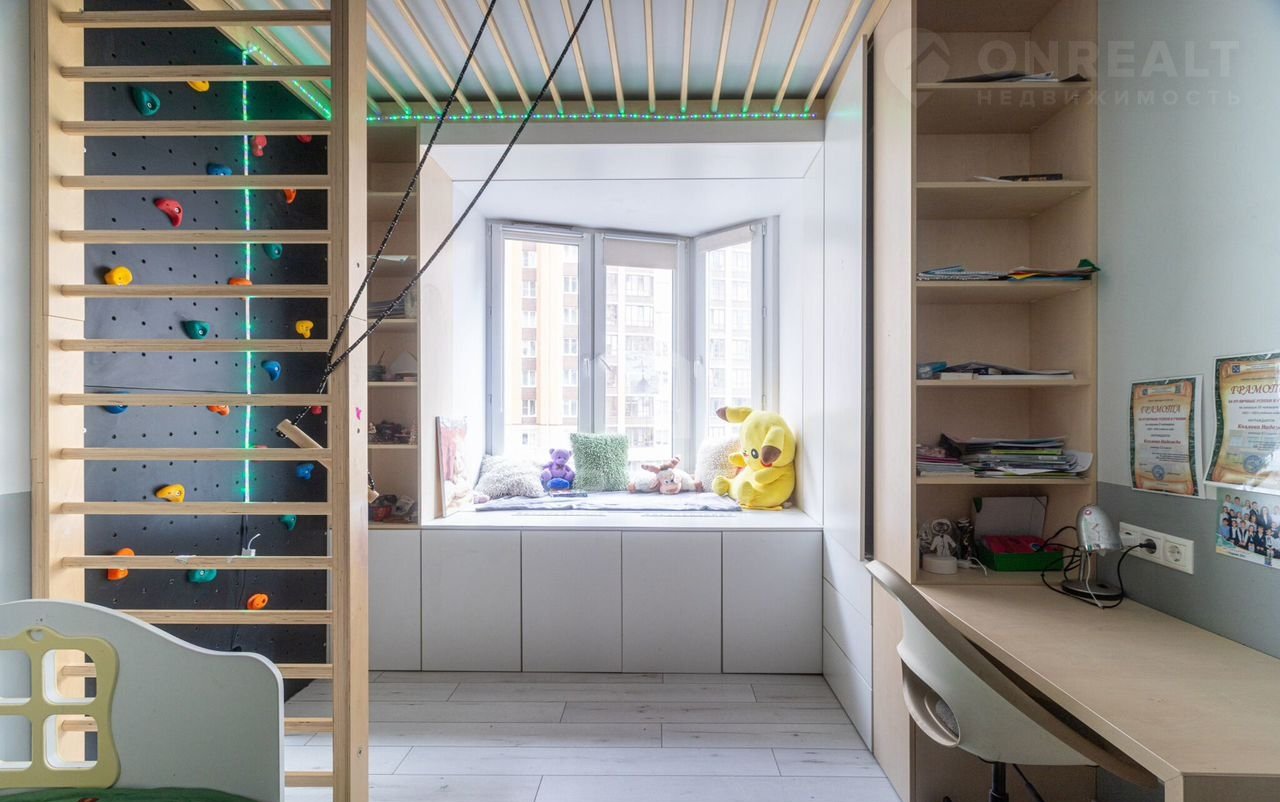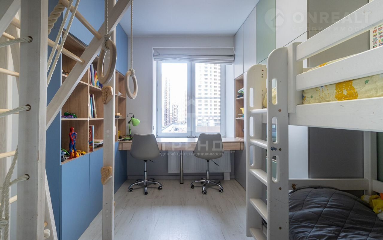 - Три изолированные комнаты : две детские площадью 12 кв.м. и 10 кв.м. с продуманными системами хранения и спортивными комплексами и родительская площадью 10,3 кв.м. со своим совмещенным санузлом и балконом.
