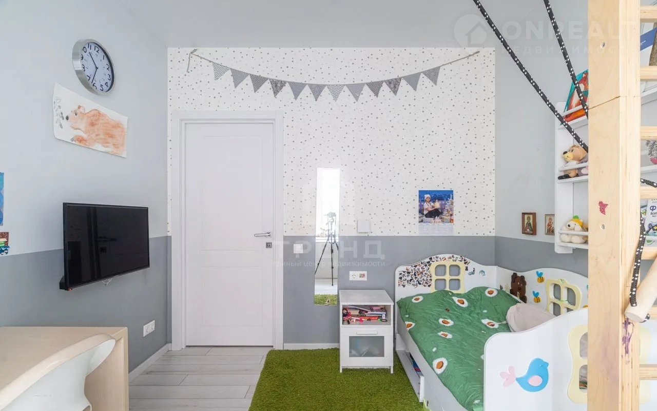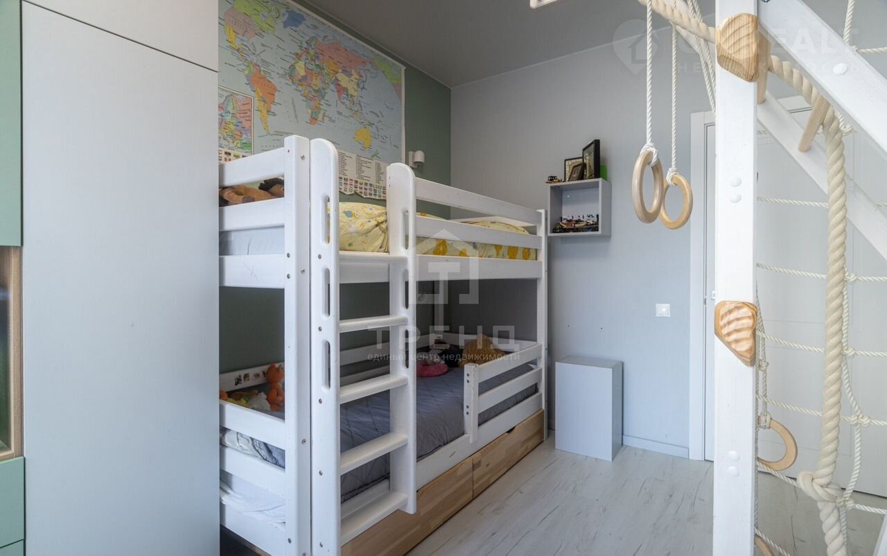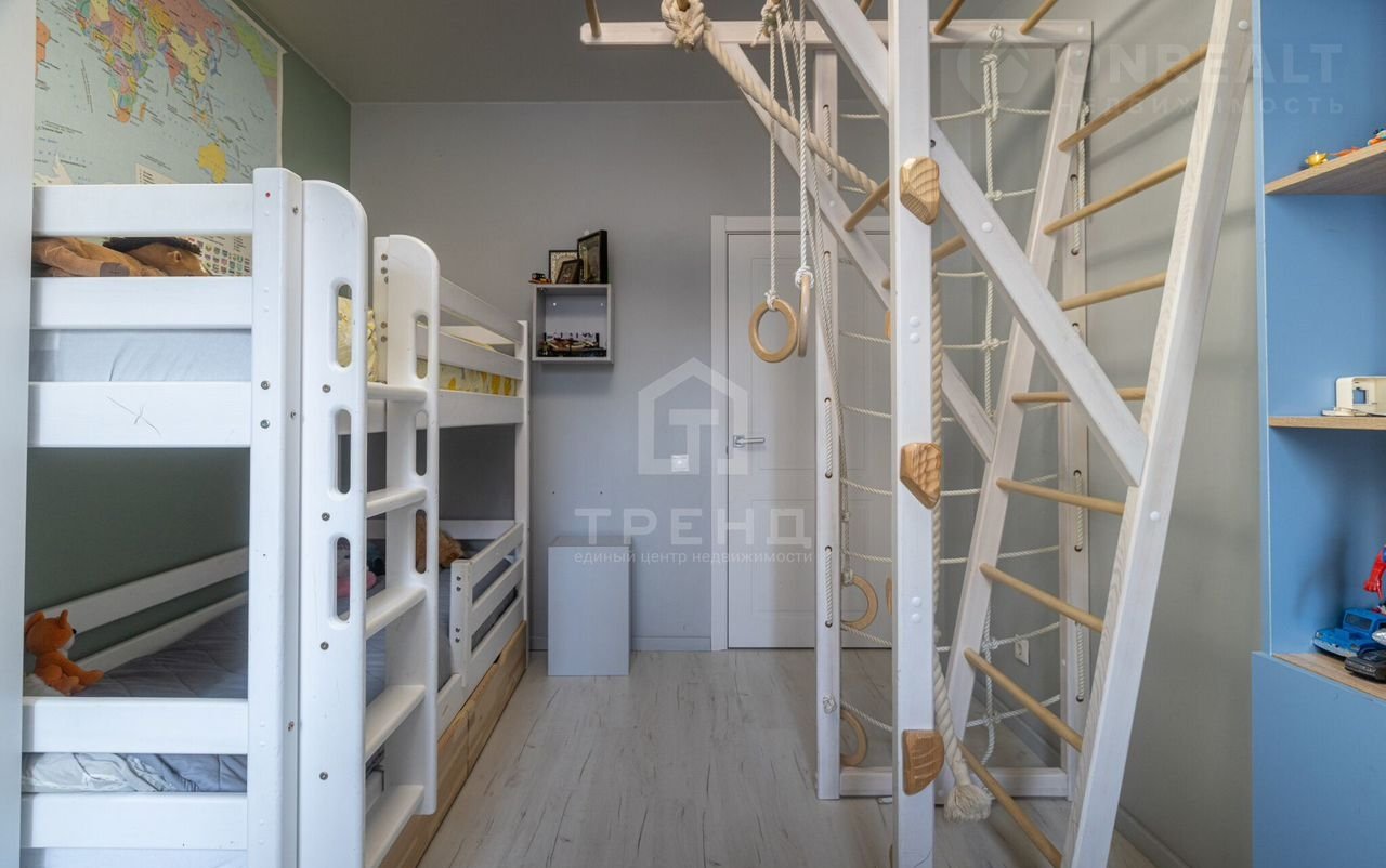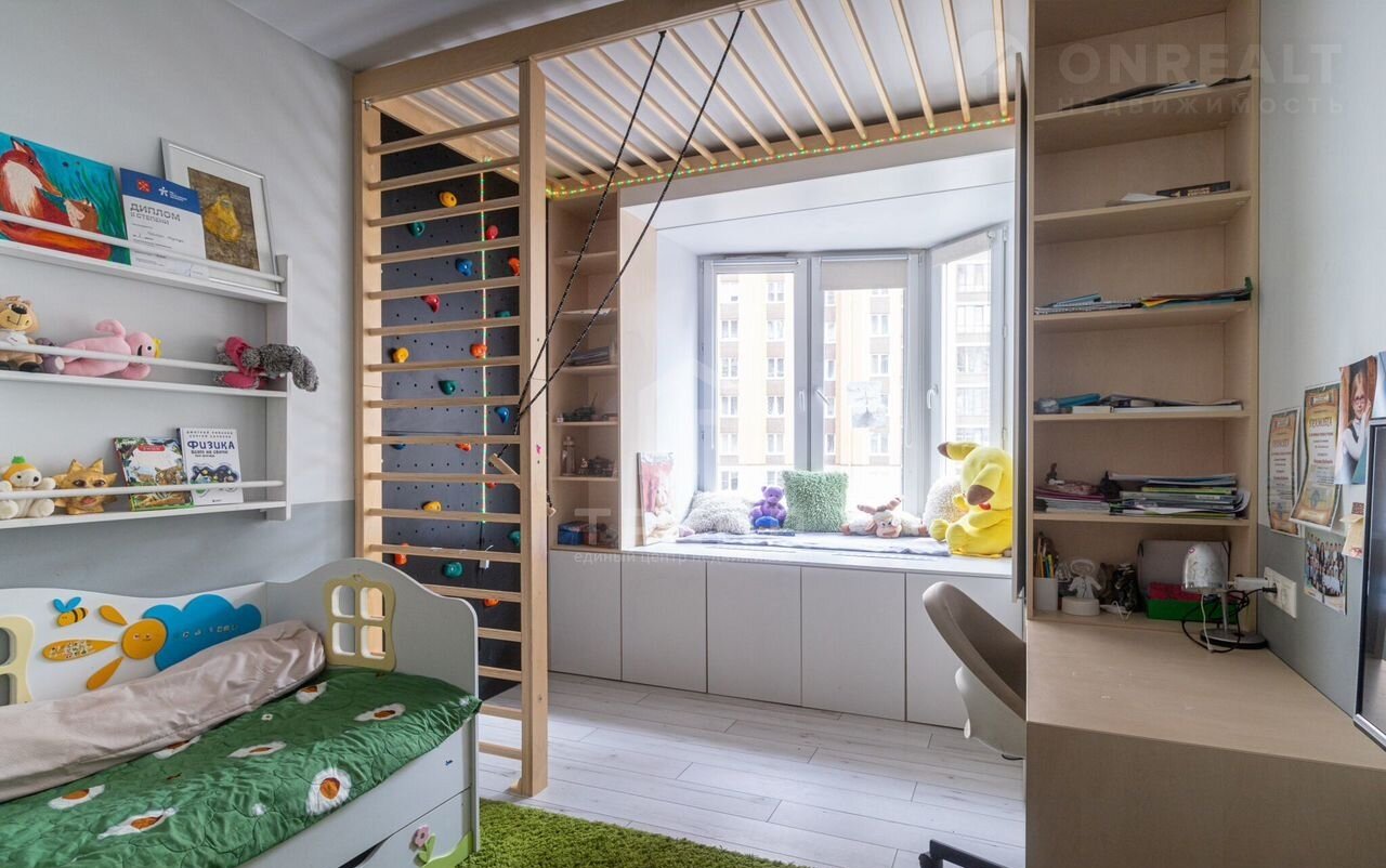 - Три изолированные комнаты : две детские площадью 12 кв.м. и 10 кв.м. с продуманными системами хранения и спортивными комплексами и родительская площадью 10,3 кв.м. со своим совмещенным санузлом и балконом.