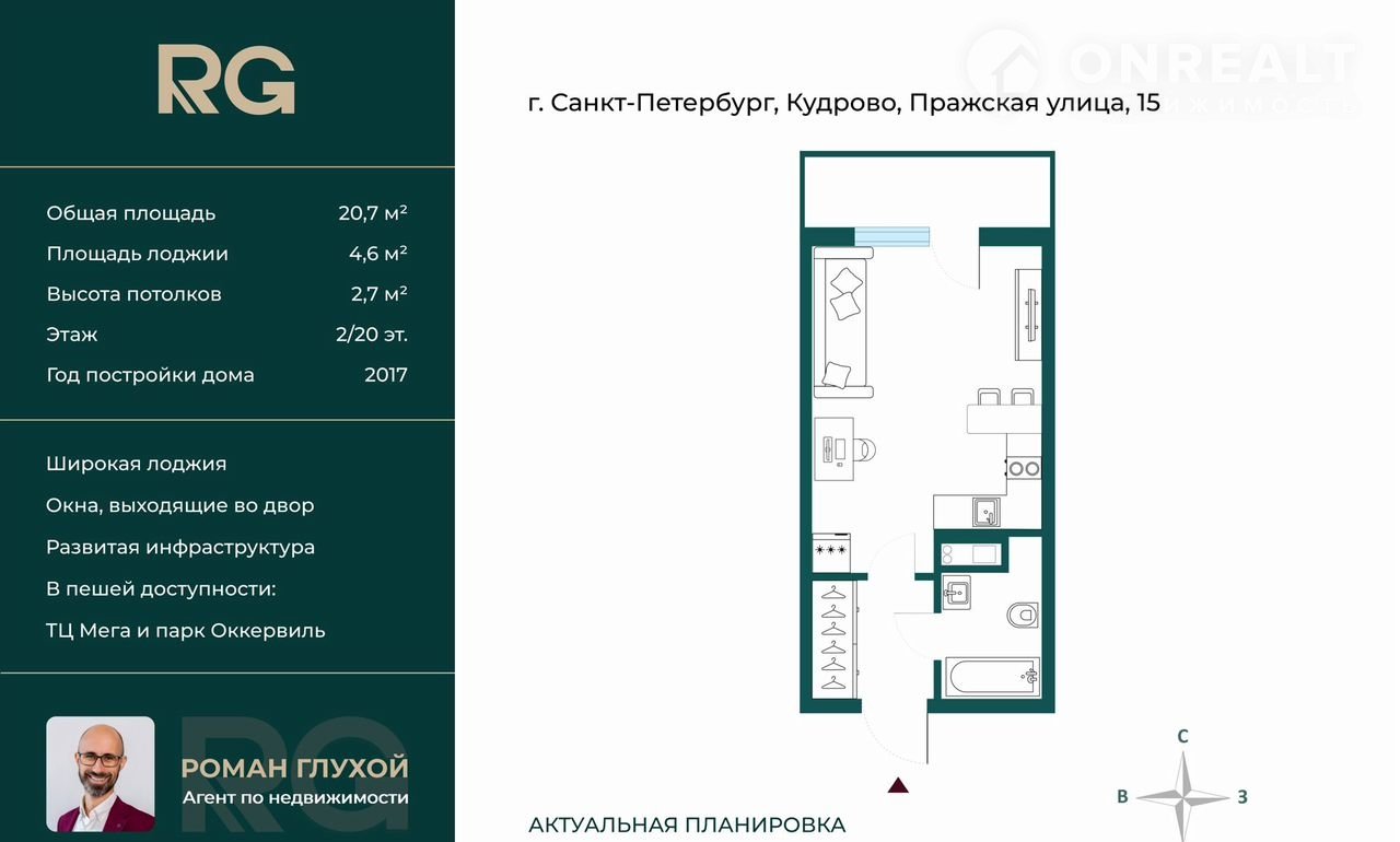 Квартира студия, 20.7 м2, этаж 2 / 13, на продажу в Кудрово, Пражская улица, 15