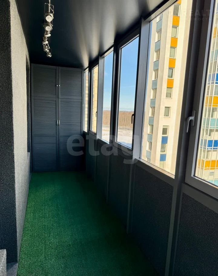 Лоджия с двумя выходами из кухни и комнаты отделана антивандальными материалами, имеет натяжной потолок и искусственный газон — идеальное место для отдыха.