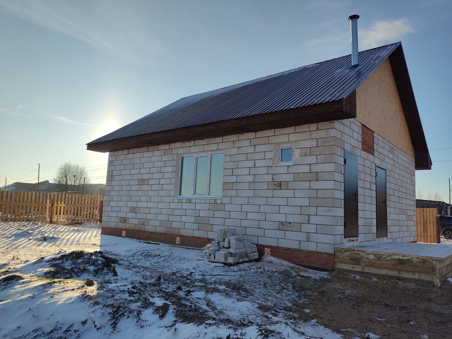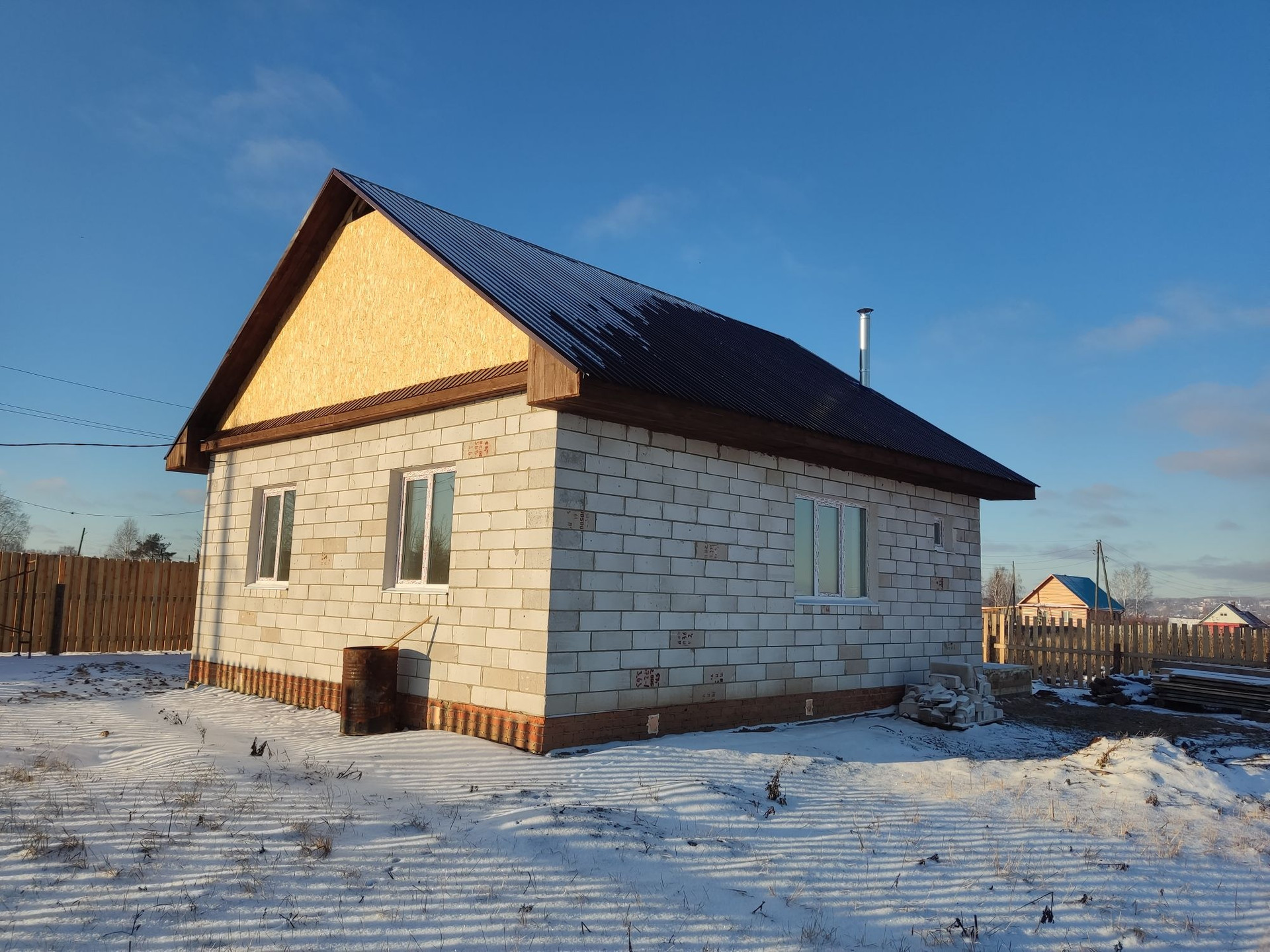 Дом выполнен из качественных стройматериалов, свайно-ленточный фундамент шириной 50 см. (сваи набивные глубиной 2 м.), цоколь шириной 50 см., материал стен пеноблок 40 см., армопояс, крыша из металлопрофиля, участок огорожен забором. В доме кухня-гостиная и три спальни, санузел совмещен, кочегарка.