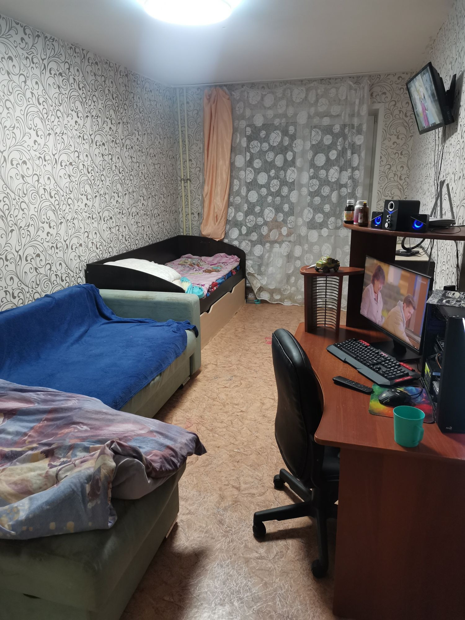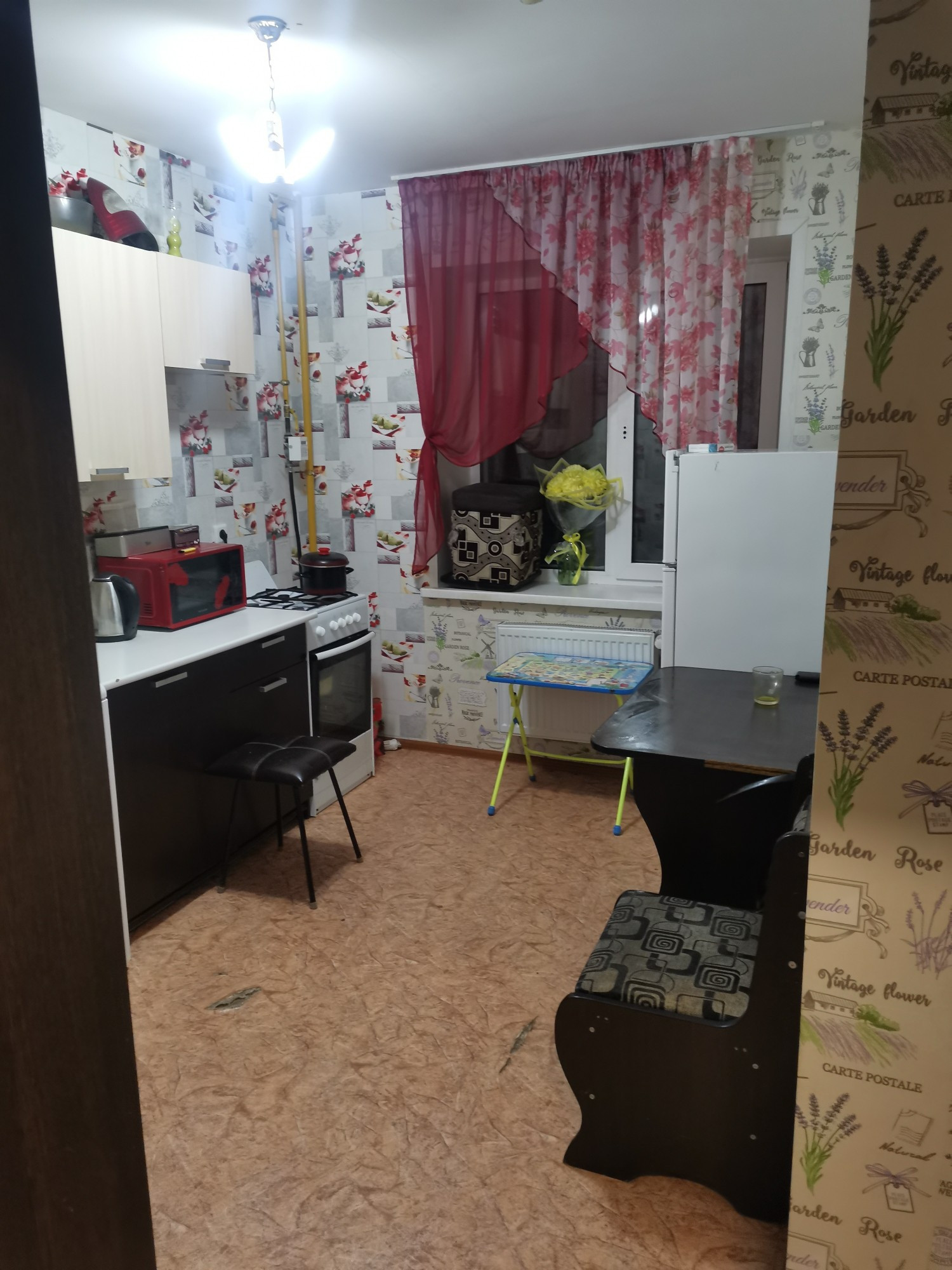 Однокомнатная квартира с косметическим ремонтом, имеется балкон, санузел большой, совмещённый, просторная кухня, мебель частично остаётся, во дворе парковка, детская площадка, рядом детский сад, школа, магазины.