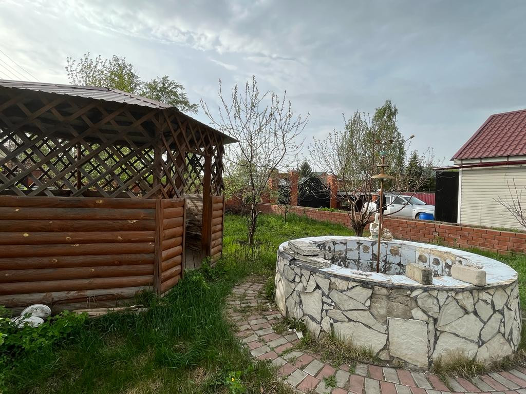 В саду имеется беседка рядом фантанчик.