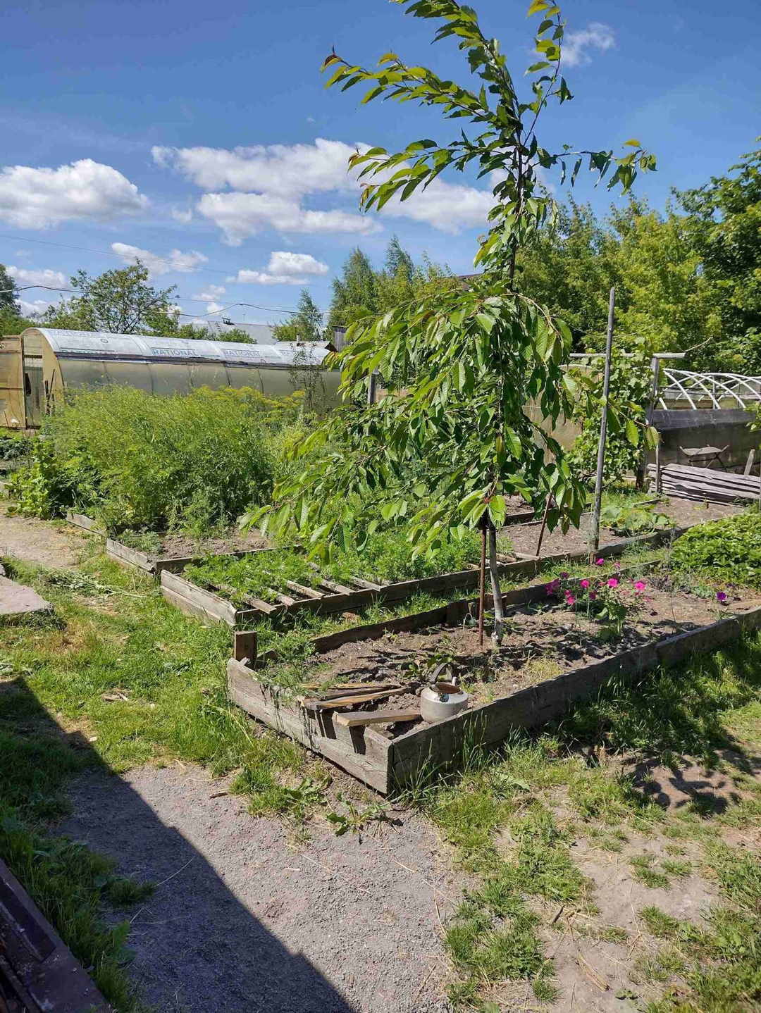 Ухоженный земельный участок. Растут сливы, молодые яблони, груша, виноград, тутовник. В будущем году ожидается урожай черешни. Есть смородина, отличный крыжовник. Теплица под огурцы и томаты. Есть парник. Сделаны грядки.