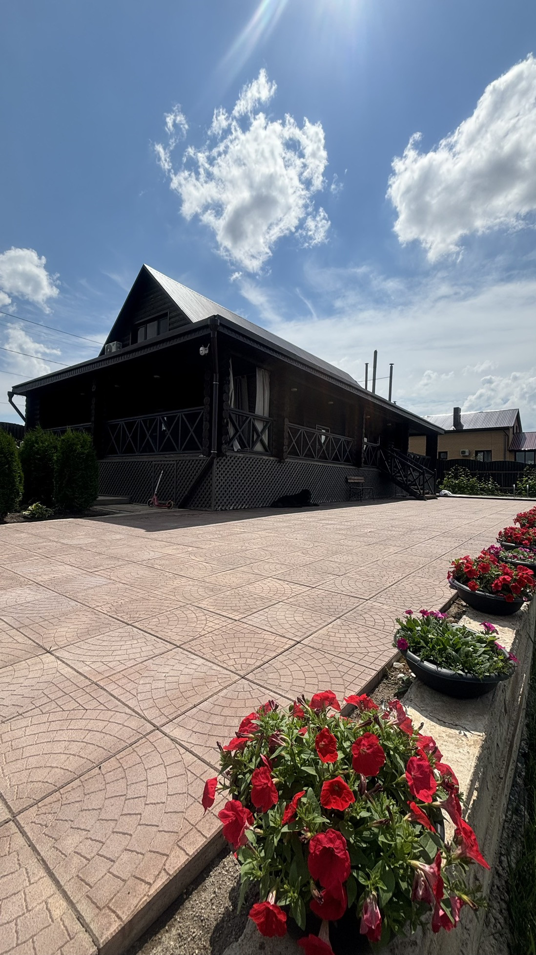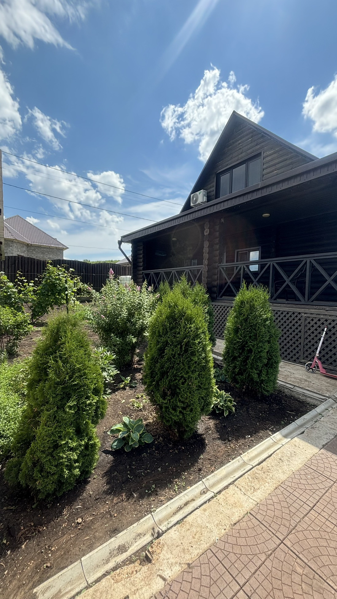 Перед входом – парковка на 4 автомобиля.  Вокруг участка высажены ели и сосны. В саду яблони, ранетки, груши, черешня, вишня, орех, ирга. Плантация малины, клубники. Живая изгородь из смородины. Туи, множество декоративных кустарников и многолетних цветов.