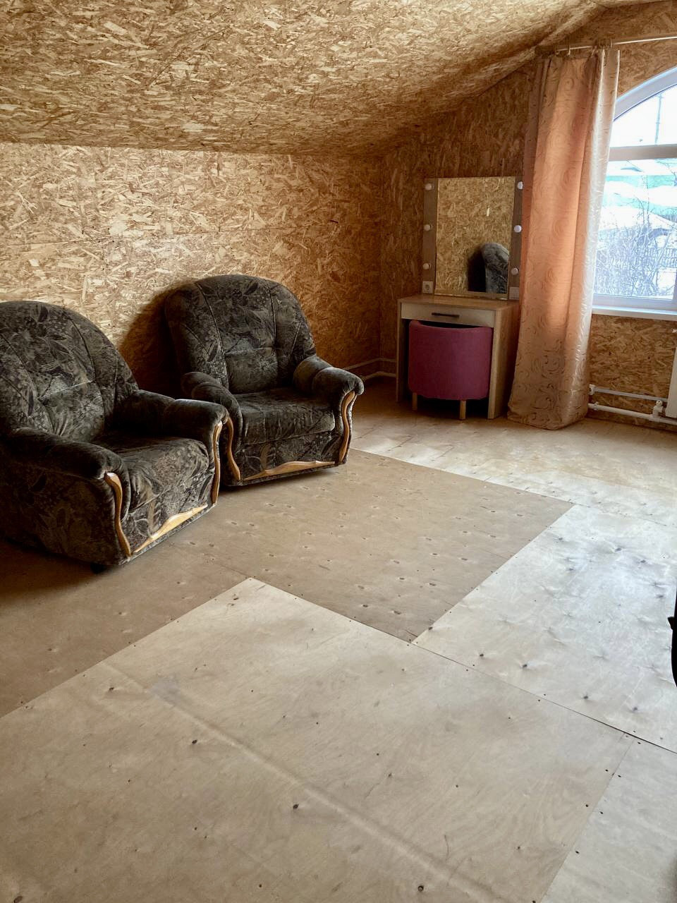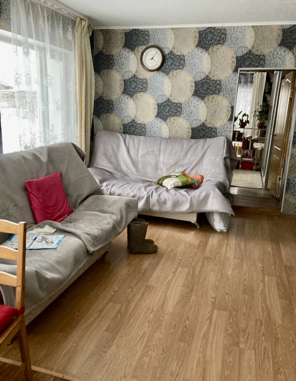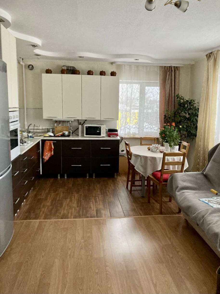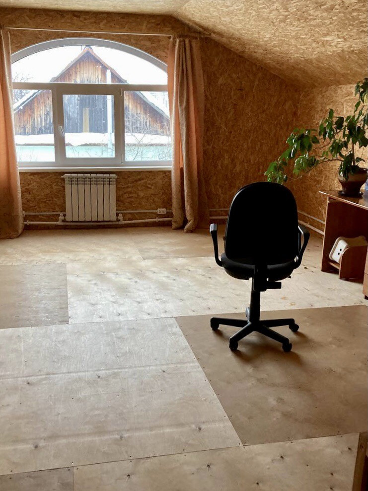 Дом двухэтажный (второй этаж мансардный). Площадь первого этажа 80 м2. Площадь второго - 60 м2. На первом этаже туалет, кухня-столовая, 2 спальни и коридор с широкой деревянной лестницей, погреб. На втором этаже 2 спальни, туалет, небольшой коридор и гардеробная. Пространство гибкое, так как состоит из перегородок, поэтому может быть переделано и использовано под любую планировку.