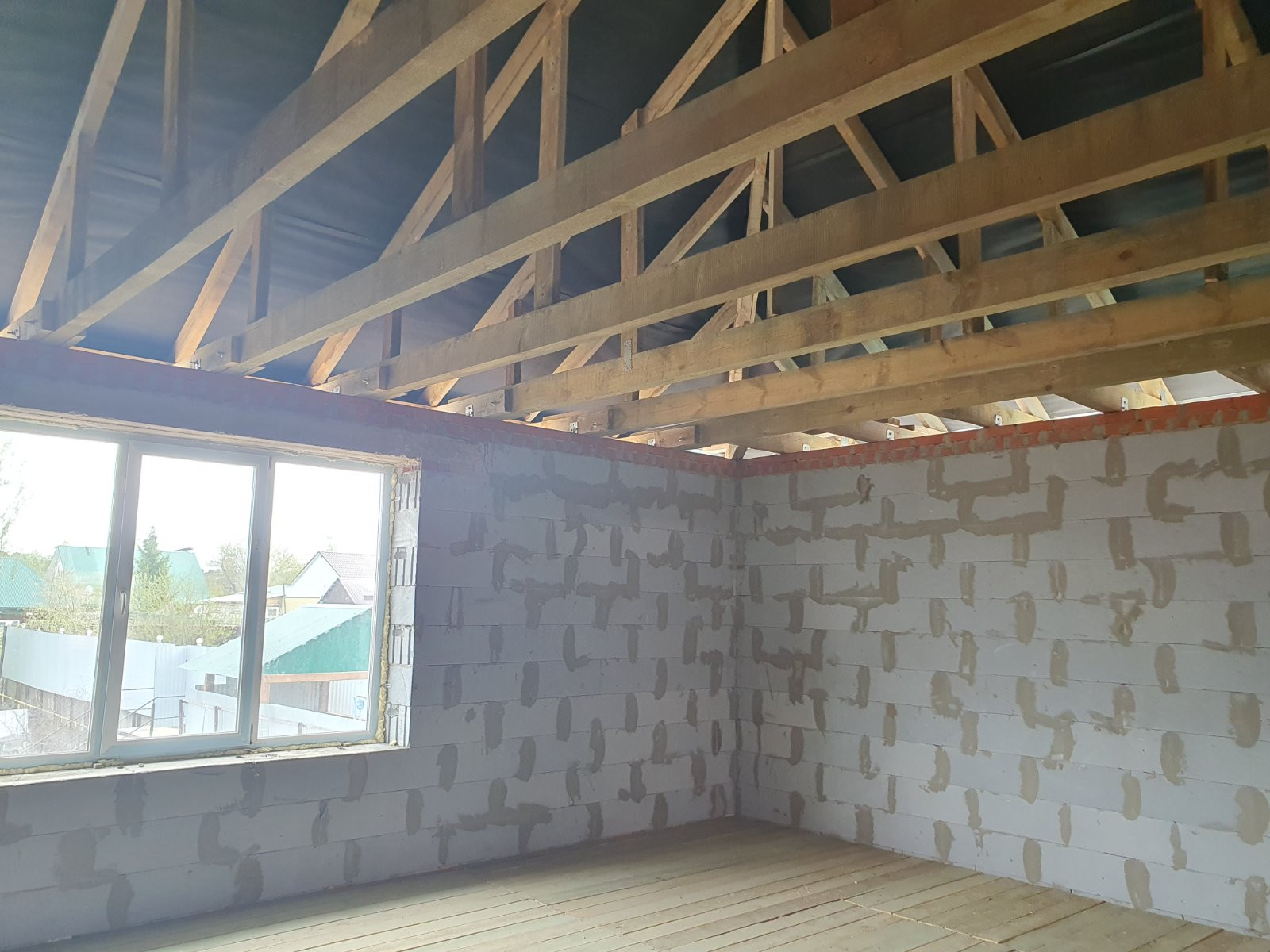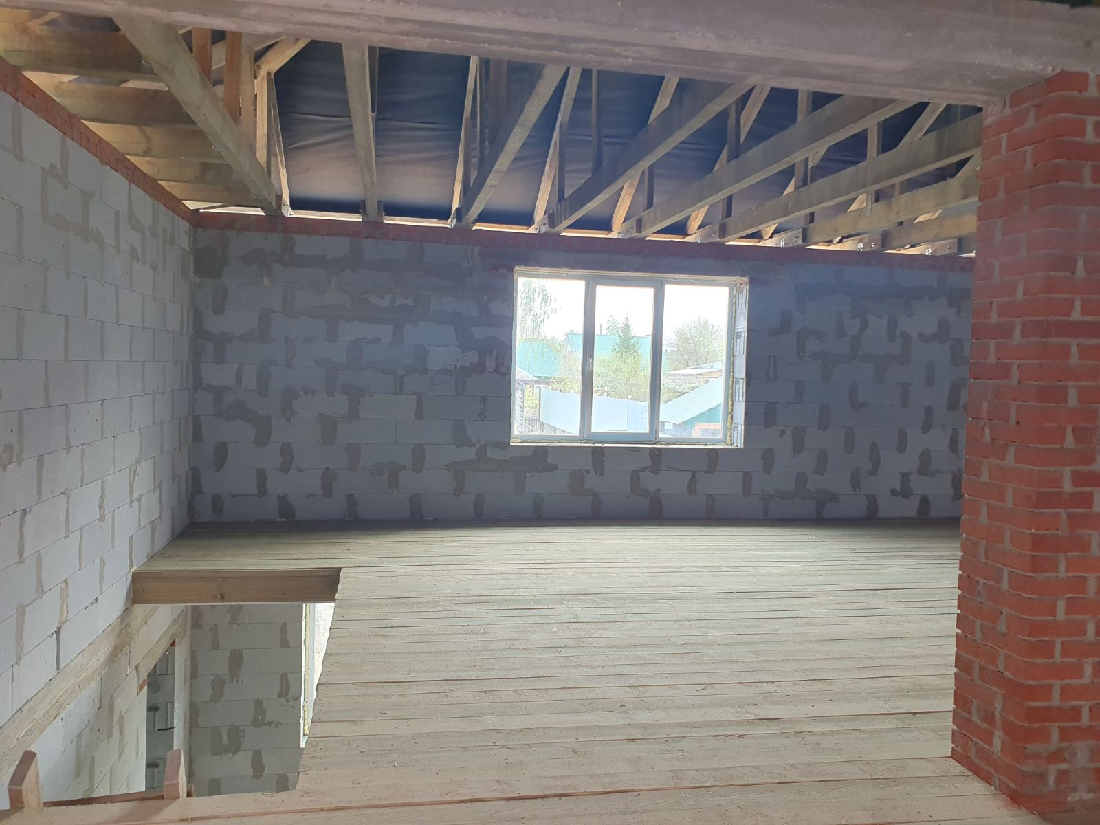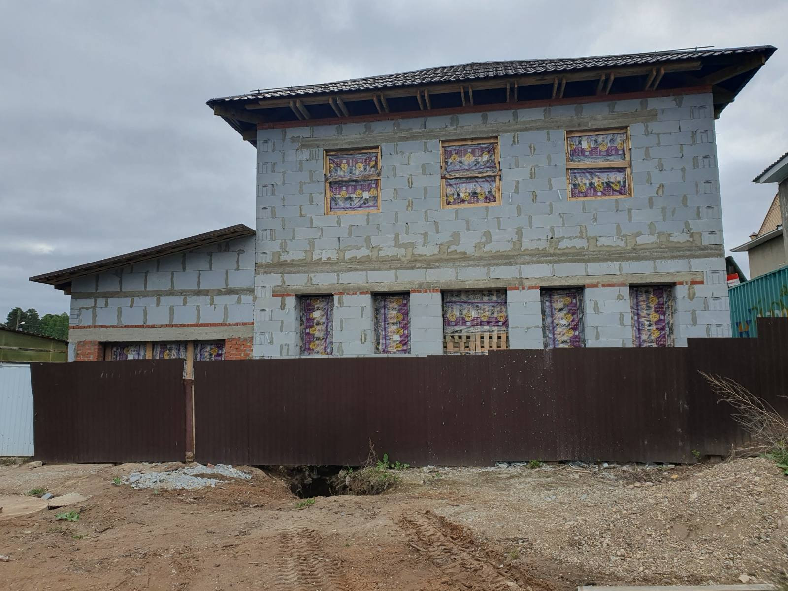 Окна установлены только с торца дома, из коммуникаций канализация выгребная яма, газ и вода проходят рядом с домом завести в дом не составит проблем.