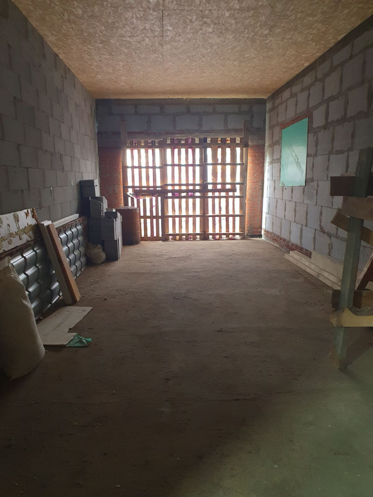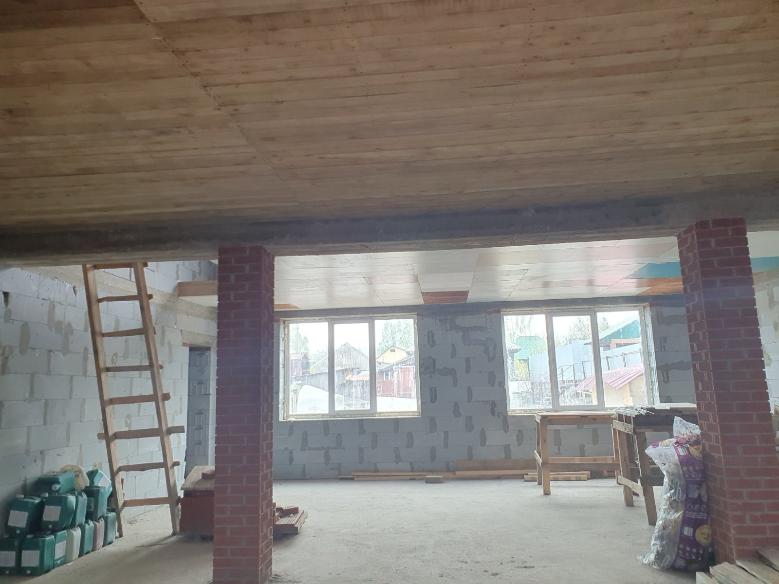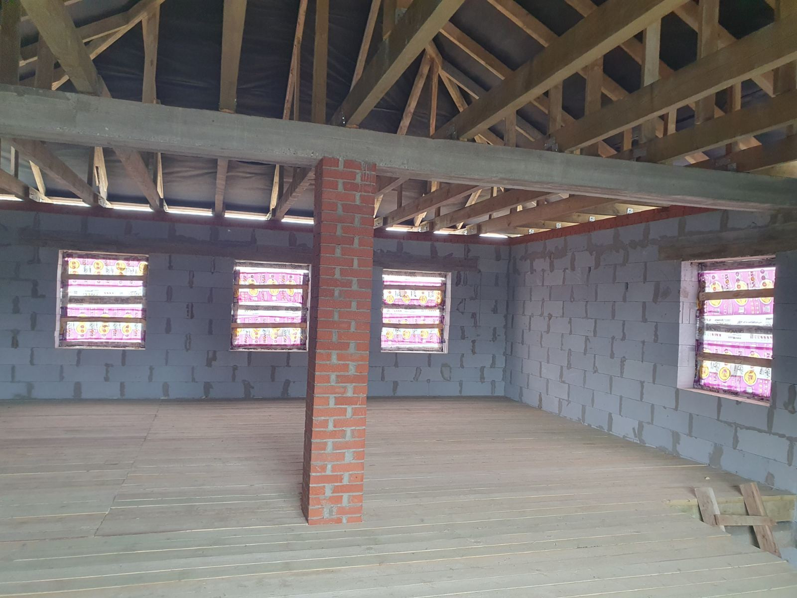 Окна установлены только с торца дома, из коммуникаций канализация выгребная яма, газ и вода проходят рядом с домом завести в дом не составит проблем.