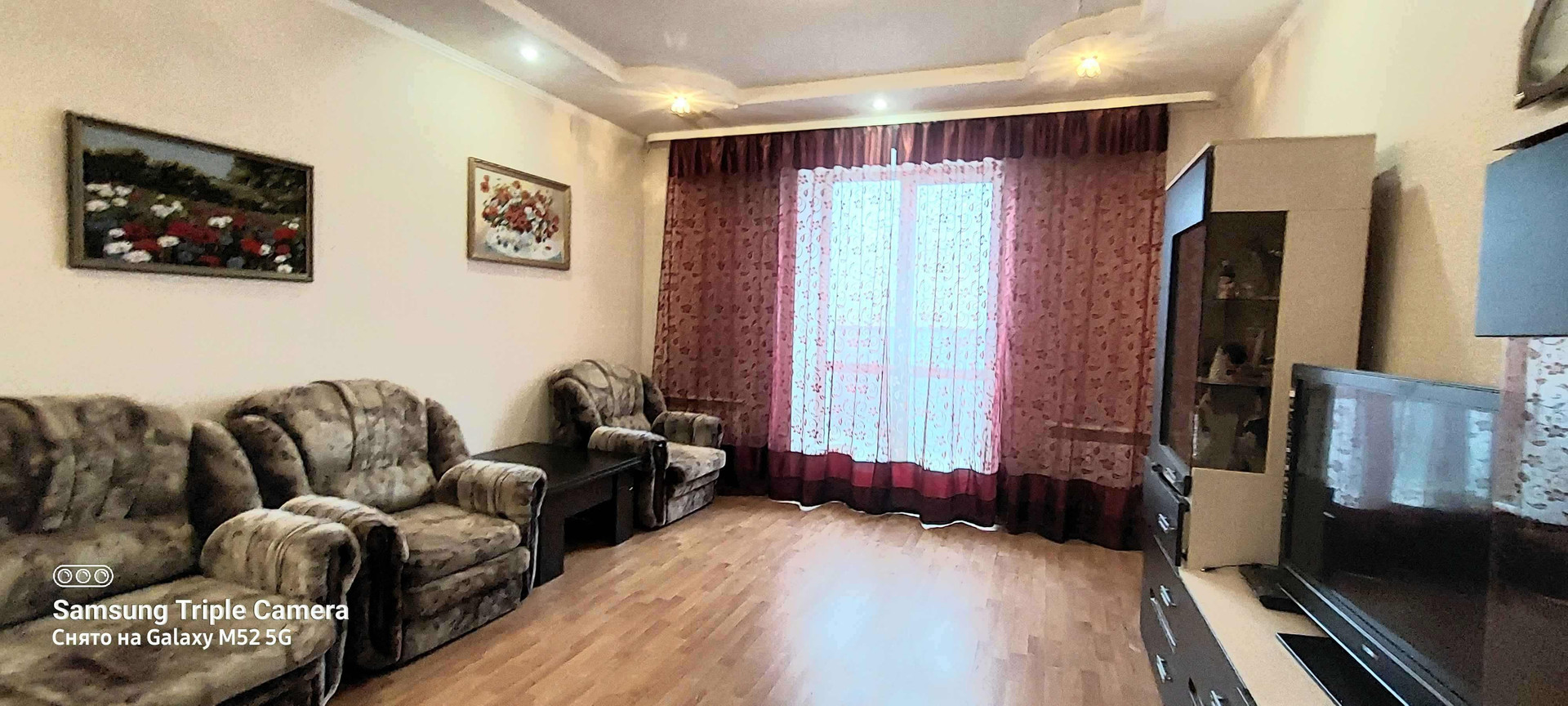 Квартира очень теплая, уютная. Потолки высокие - придают ощущение простора! Имеется балкон. В гостиной комнате панорамное окно.