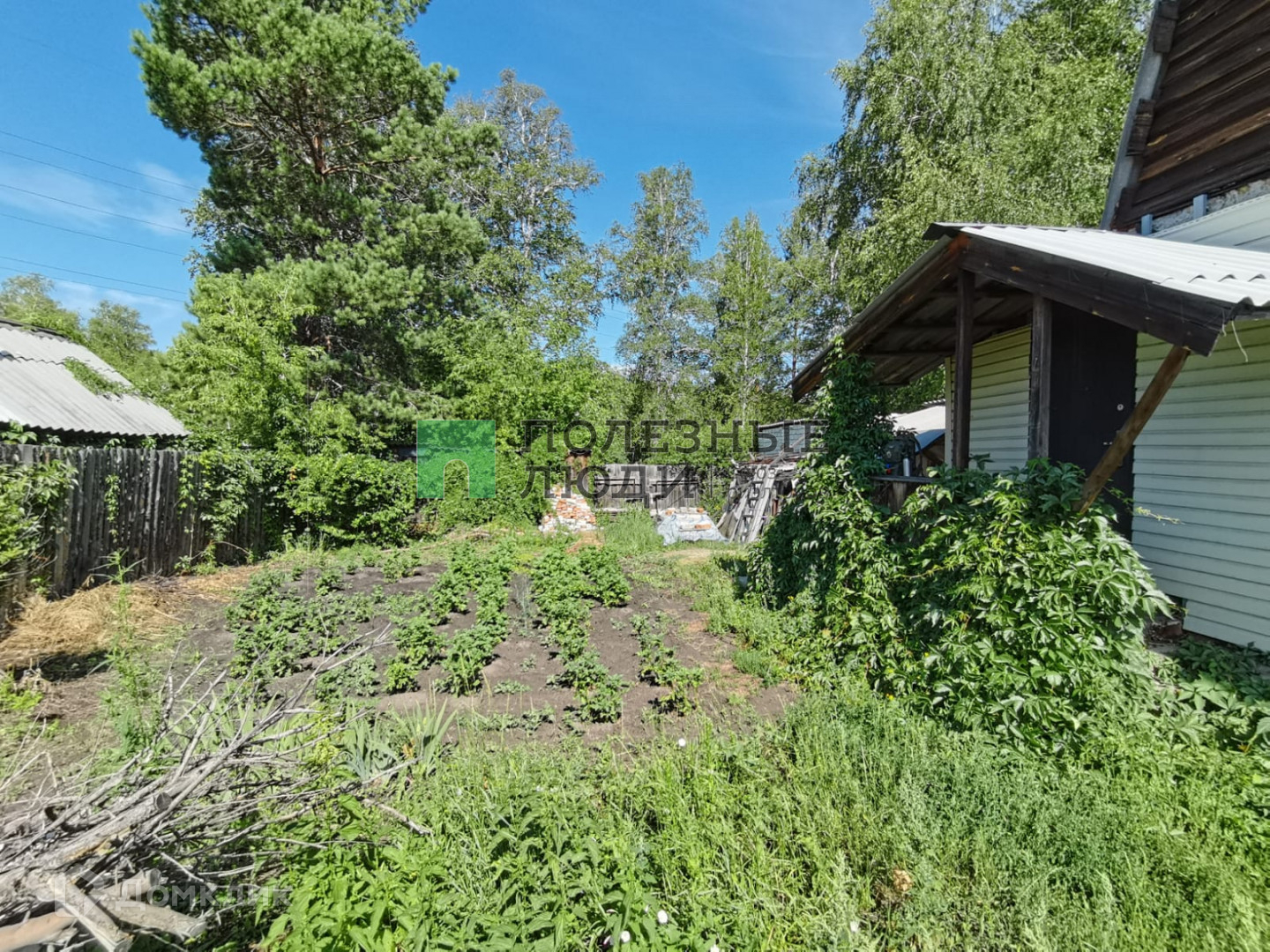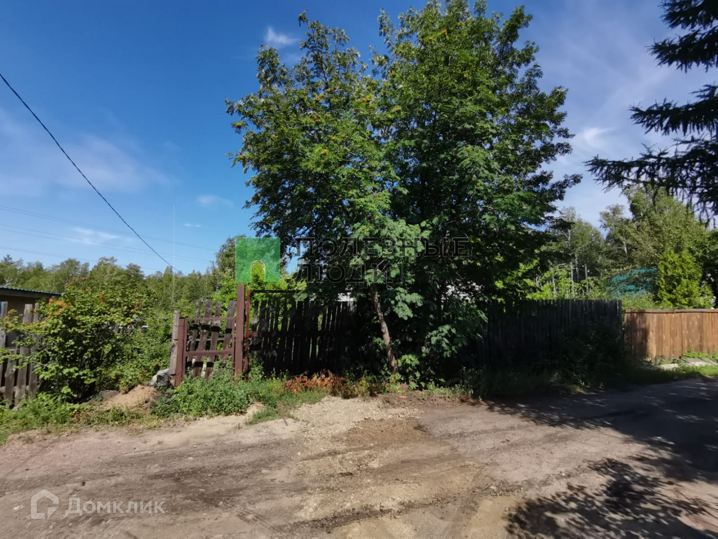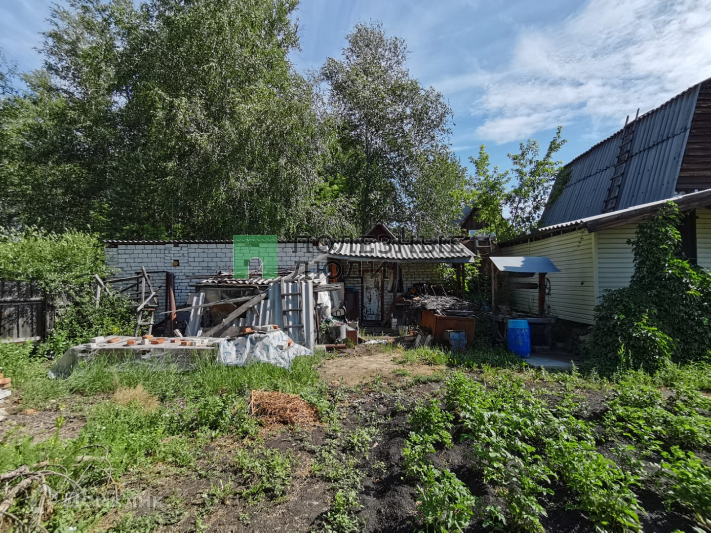 Участок площадью 9 соток, подведен природный газ, осталось завести его в дом. Имеется колодец с водой для питья и полива. Баня кирпичная 3x4 м, внутри обшита вагонкой, гараж 4x5 м. Есть возможность подъезда к участку со стороны леса.