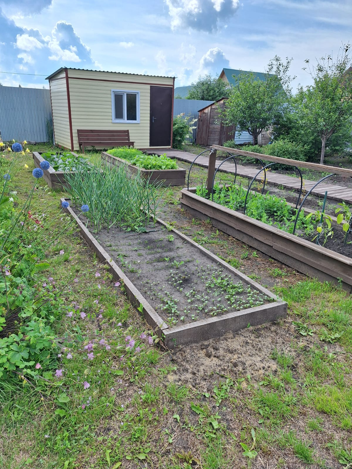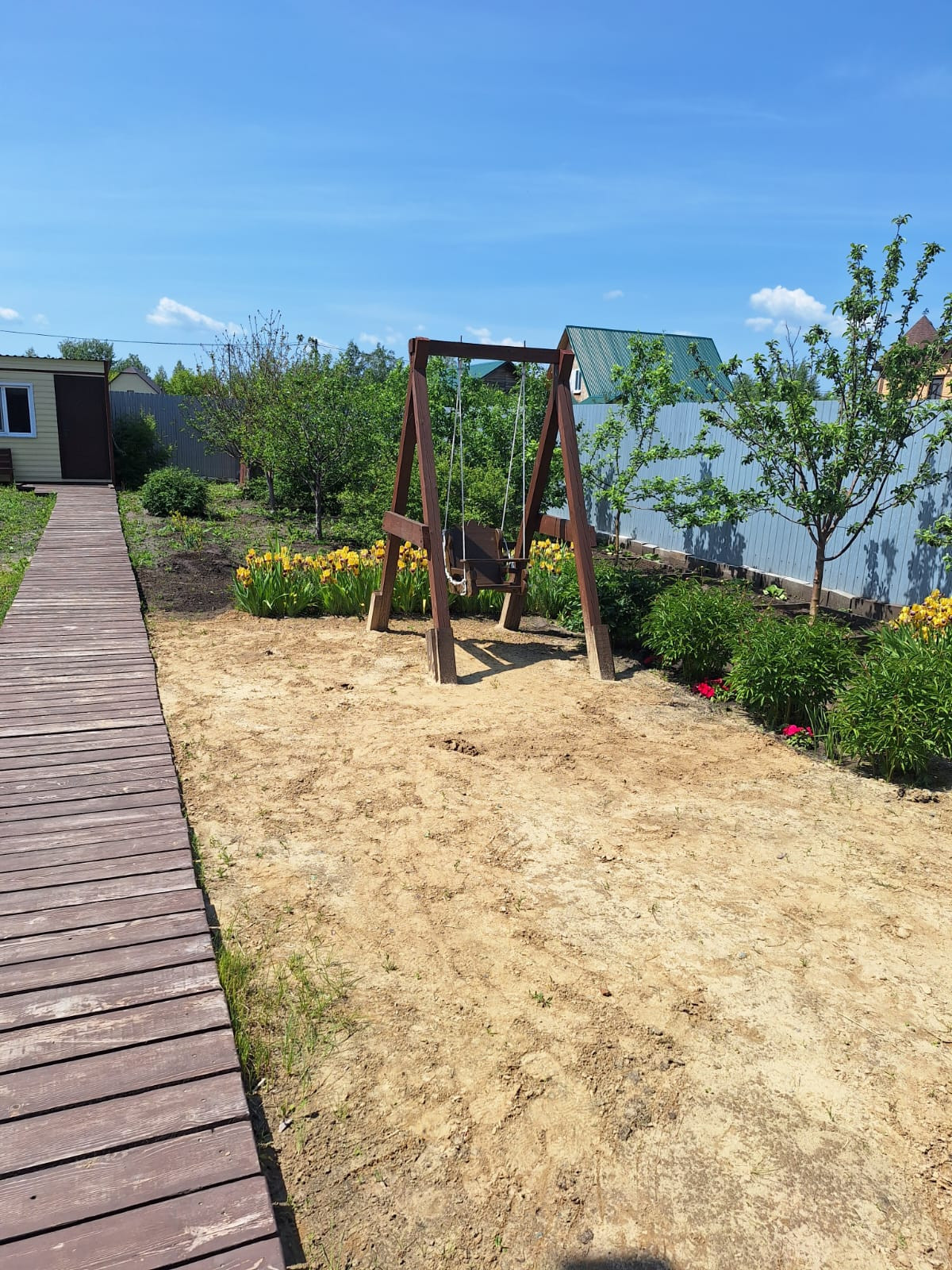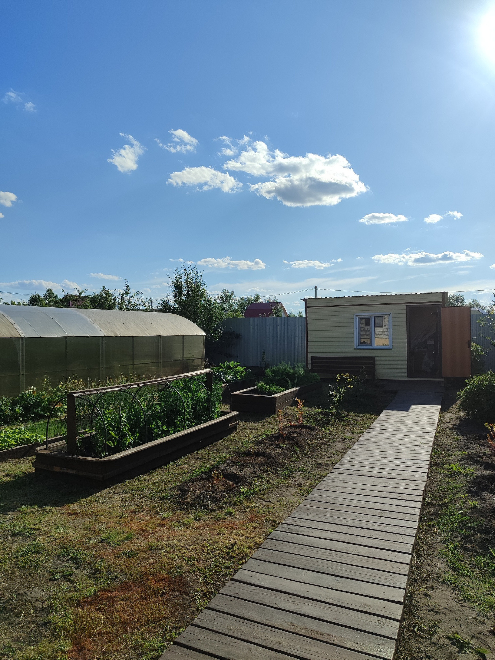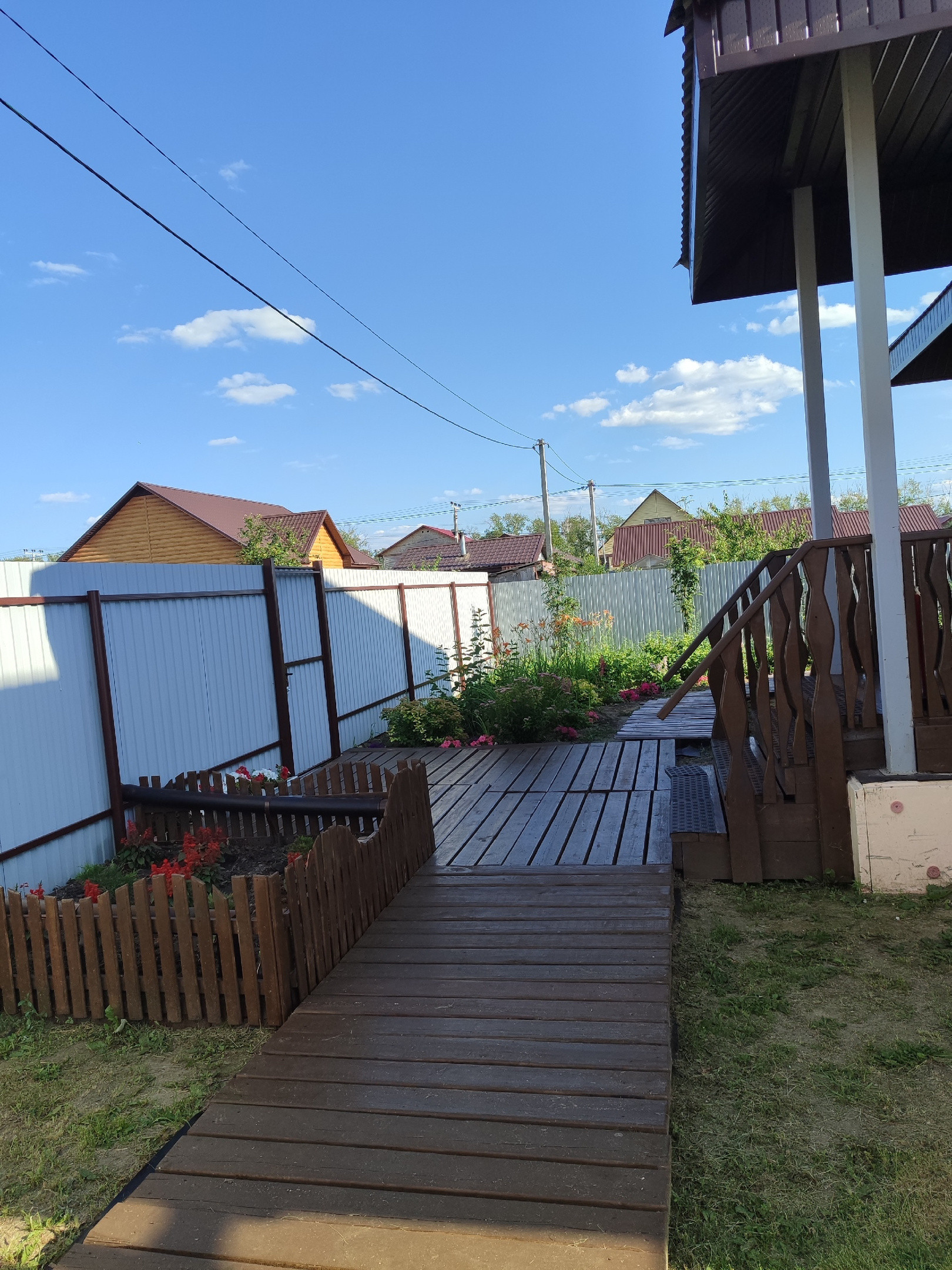 Вход на участок и дорожка по участку выложены деревянным настилом.