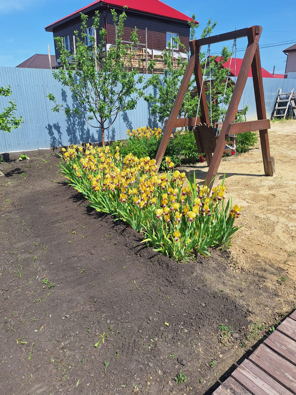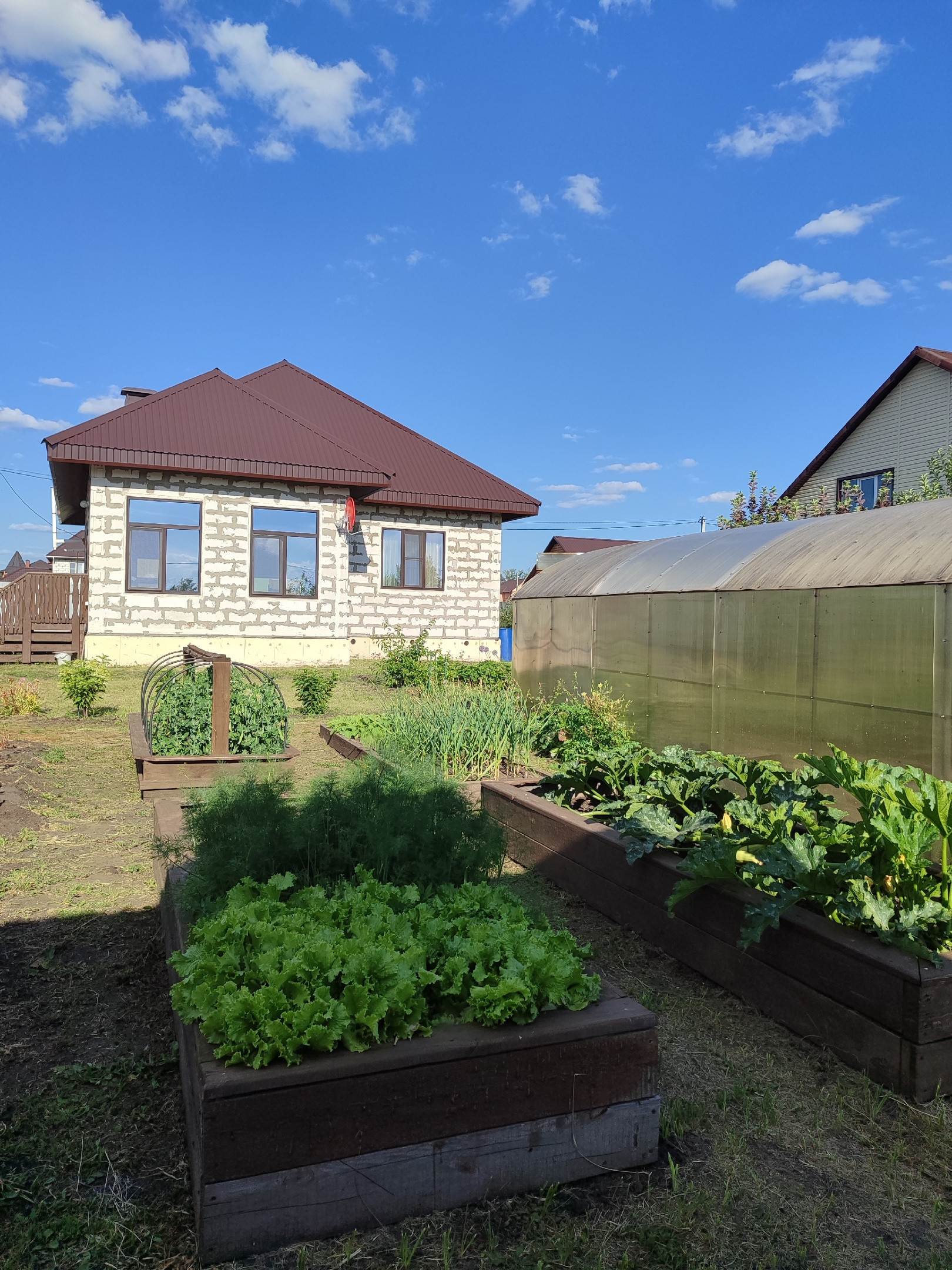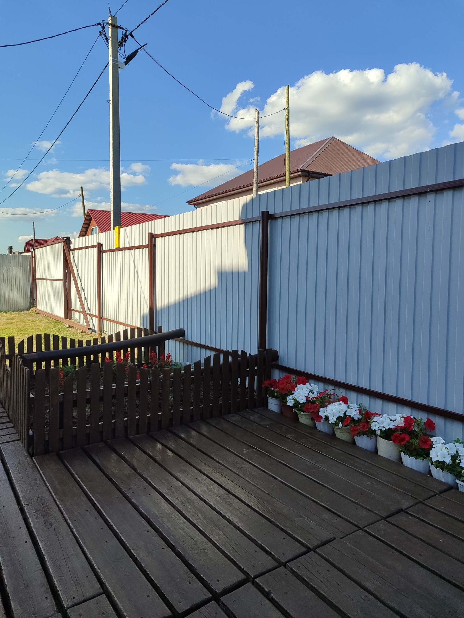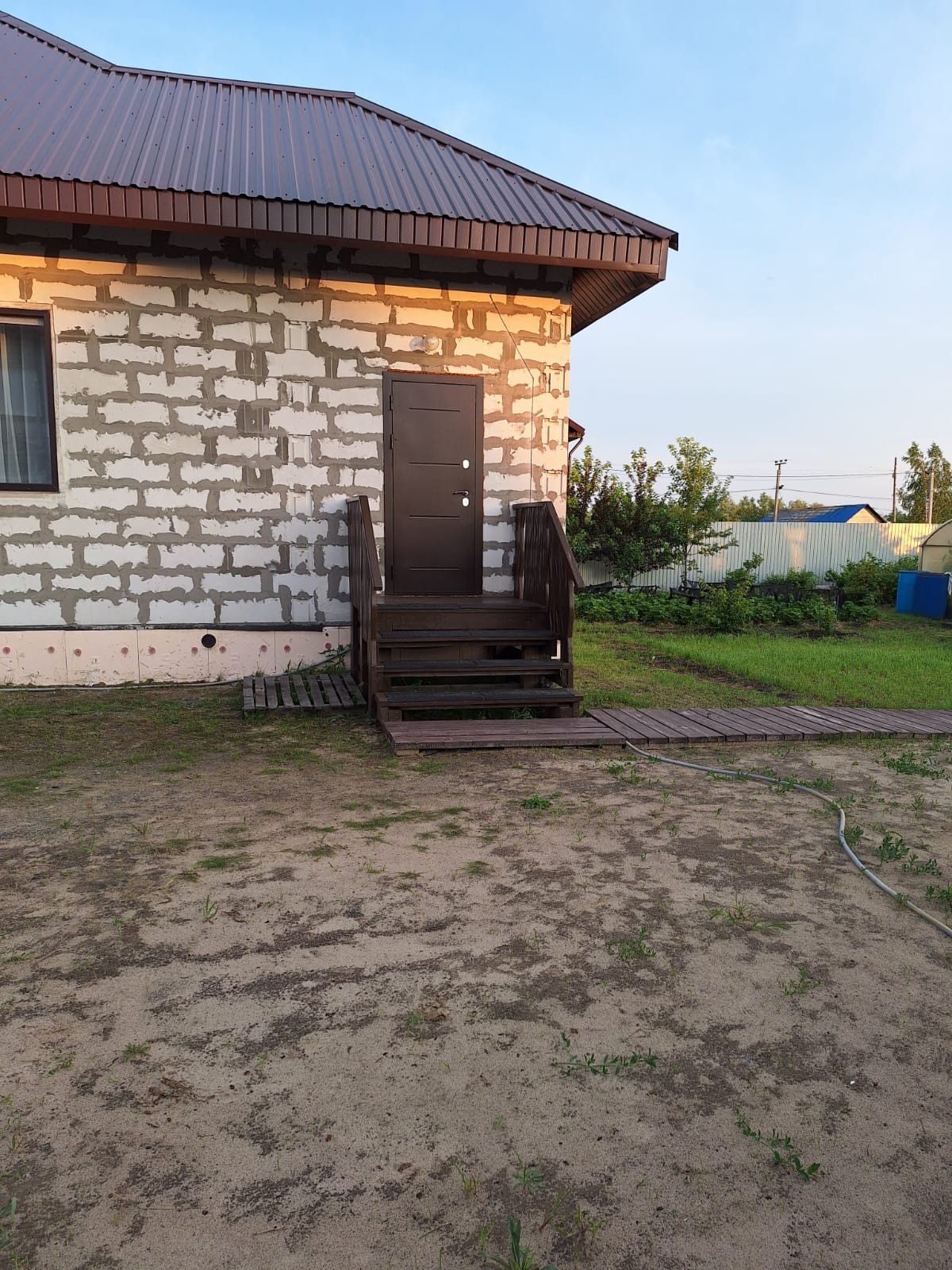 Вход на участок и дорожка по участку выложены деревянным настилом.
