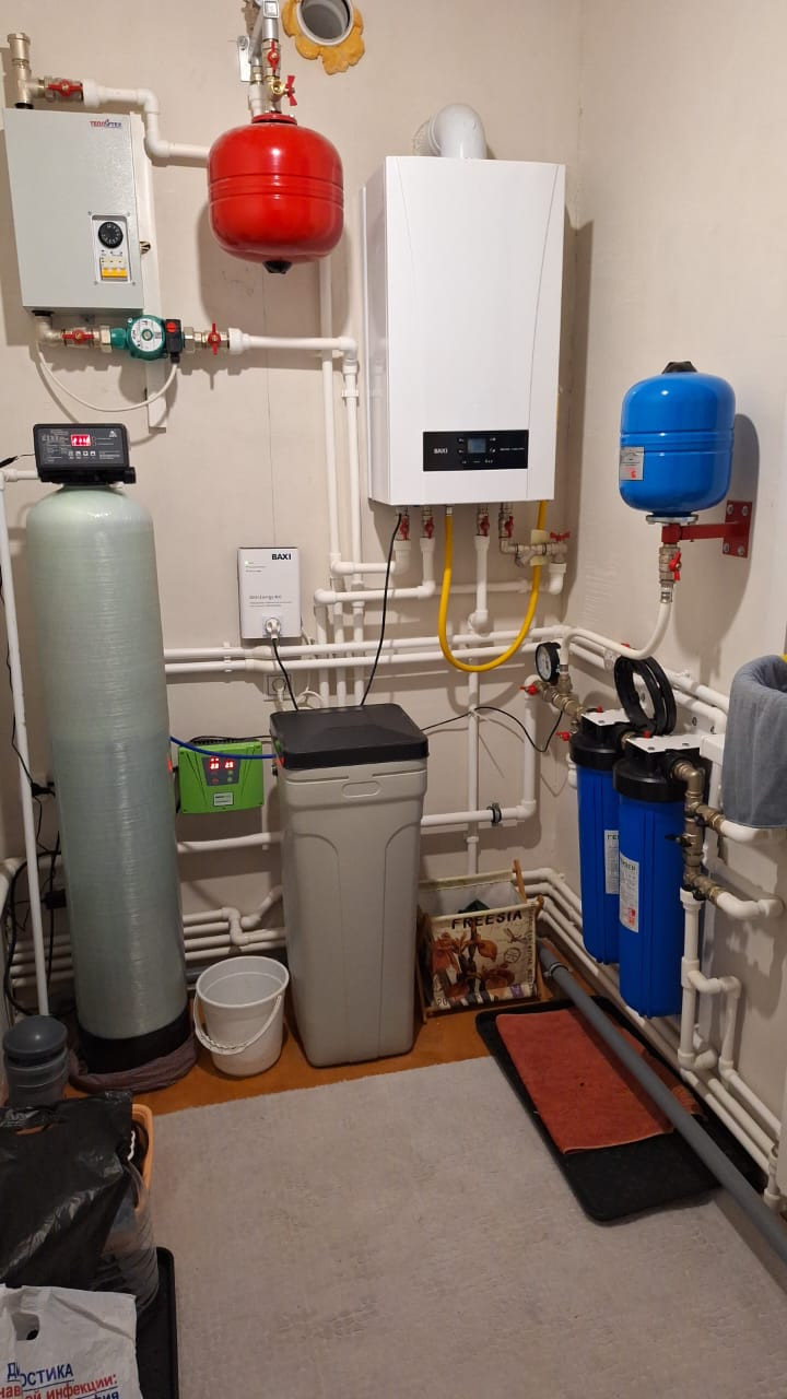 Газовый котел BAXI, вода в дом заведена из скважины, водоподготовка, септик на 8 кубов.