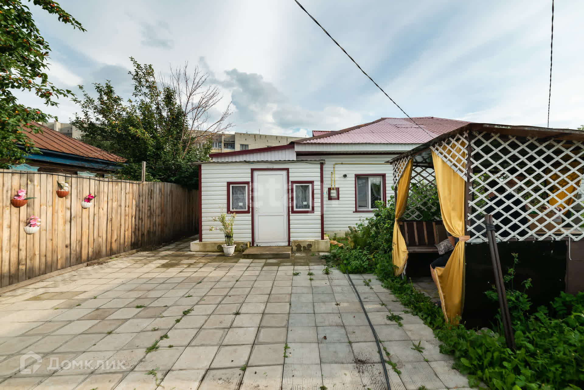 Двор выложен тротуарной плиткой. Есть беседка для отдыха. Есть металлический гараж. Входные ворота и калитка кованые.