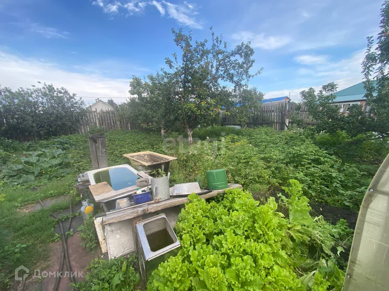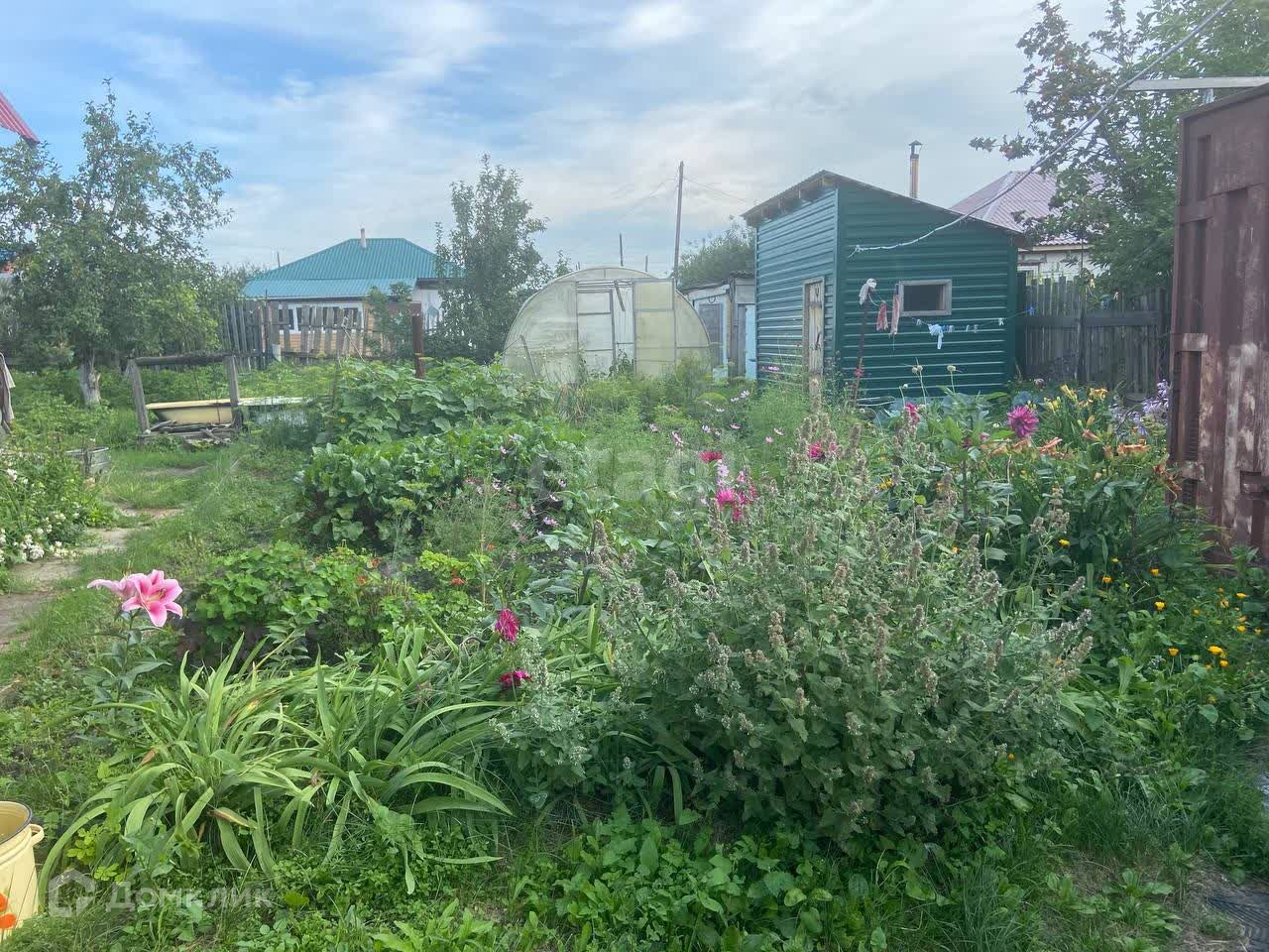 Разработанный огород, много насаждений таких как яблони разных сортов (3 шт), вишня, малина, виктория, многолетние цветы.