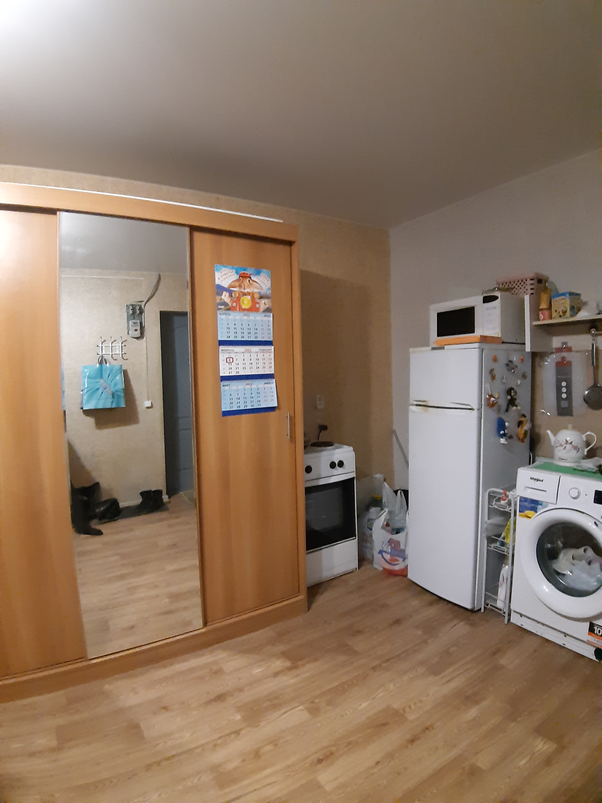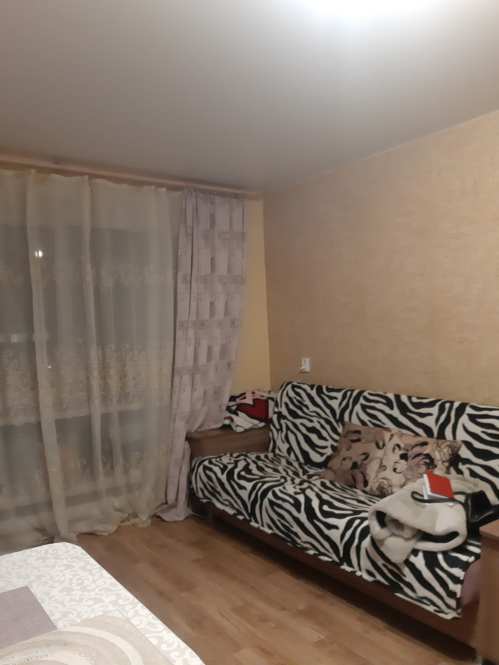 Комната не угловая, солнечная. Сделан косметический ремонт(натяжной потолок, ст/т, на полу линолеум), заведена вода. Свой туалет, душ