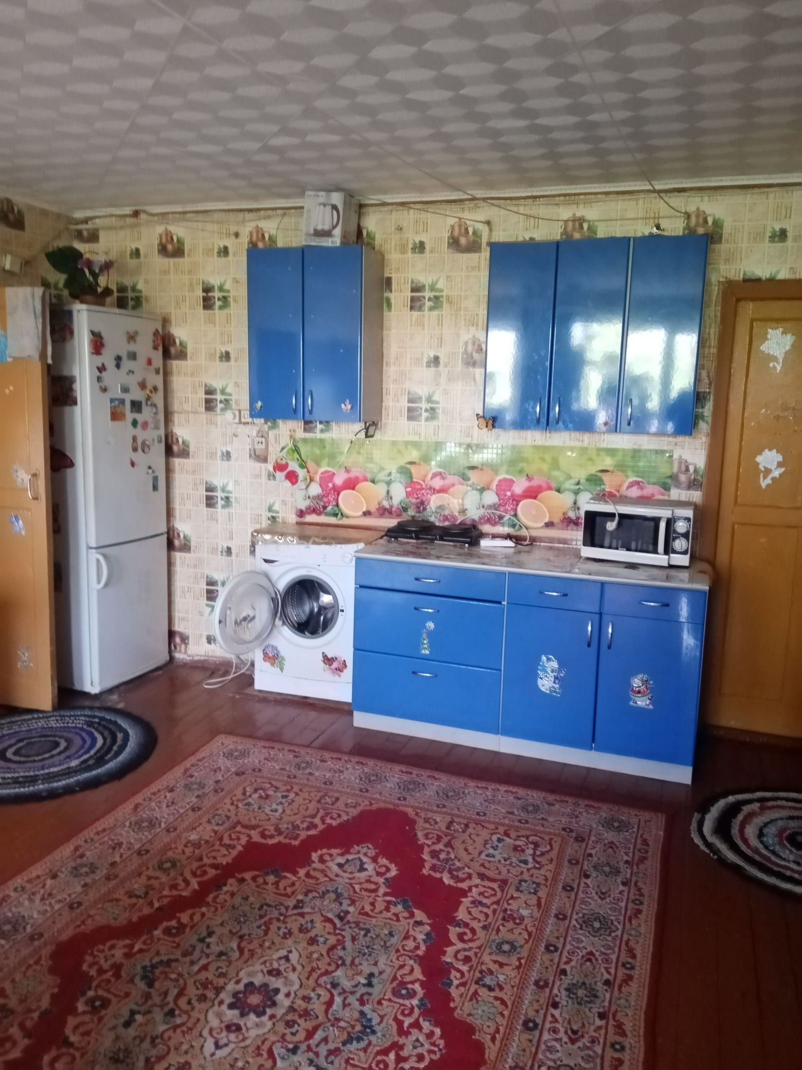 Для вашего комфортного проживания в комнате остается диван, шкаф-купе, тумбочка под телевизор; в секции - кухонный гарнитур (синего цвета, есть на фото), кухонный стол.
